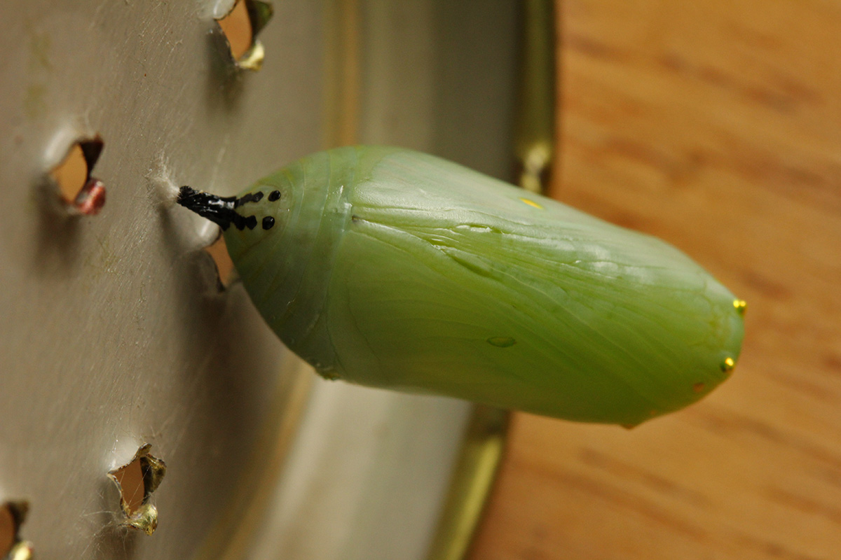 i took a more careful look at the cattwo chrysalis tonight, and i think it's going to be another female monarch. it was hard to tell yesterday, but after a day of aging, i can definitely see the vertical line beneath the two dots.
