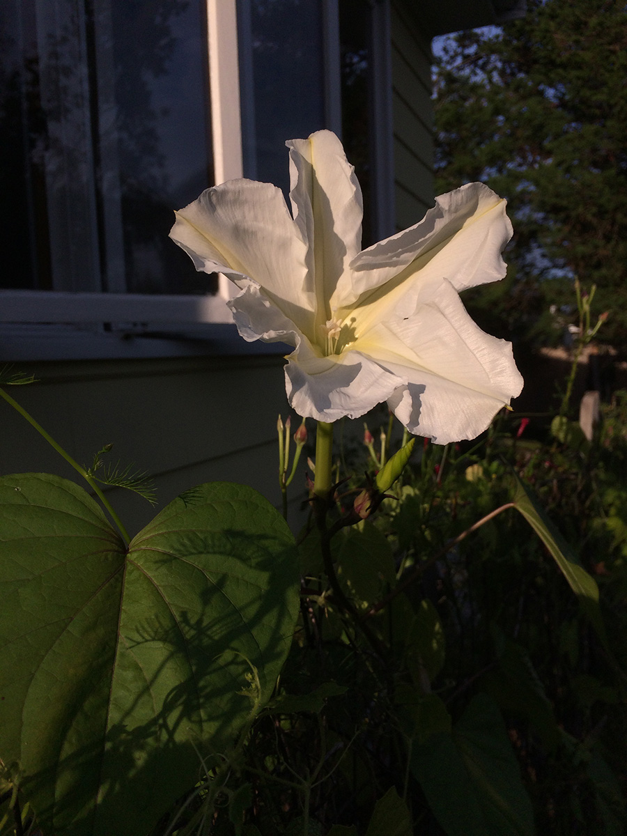 what i thought was a bottle gourd flower turns out to be a moonflower instead. i forgot i planted a few, must've escaped detection, matured enough now for some blooms. moonflowers look just like large morning glories except the flowers are all white and they only open at nights, pollinated by moths.