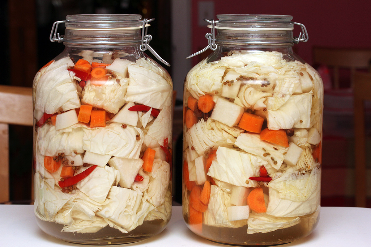 my paocai has begun to float. that gap at the bottom means i could've stuffed even more vegetables into the jar (although i just had enough to fill both). there doesn't seem to be enough brine as it appears dry on the top, but in my experience the brine level will eventually rise as the gases push the liquid upwards.