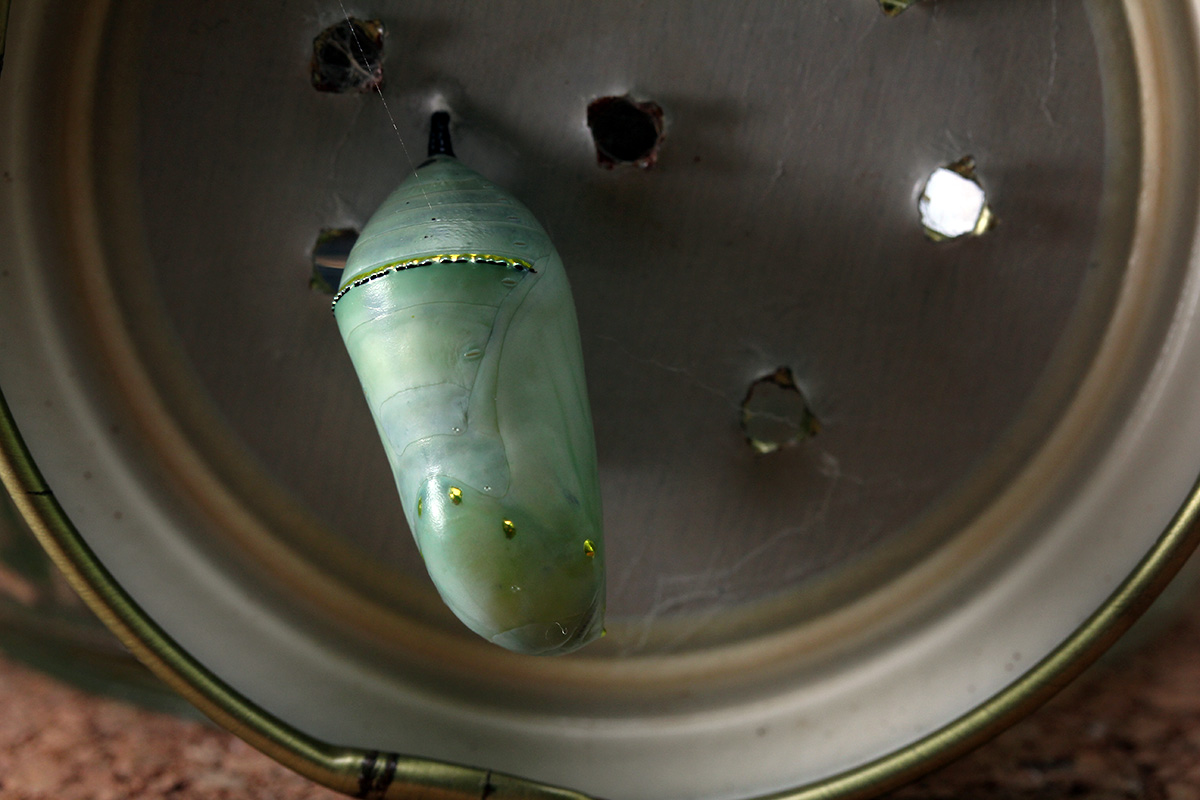 judging by how i was wrong with my prediction on when catone would emerge from her chrysalis, there could be a chance cattwo will emerge tomorrow morning. developmental wise the two caterpillars are about 3 days apart. cattwo's chrysalis is already showing some darkening; not as transparent as bruce's chrysalis, but very similar to how catone was before it emerged. so just to be safe, i perched the chrysalis lid onto two jars in case the butterfly does emerge tomorrow, it will have room to expand her wings. most likely it won't eclose until tuesday morning, when it will have to contend with the start of tropical storm jose grazing by new england.