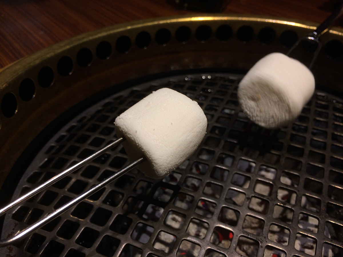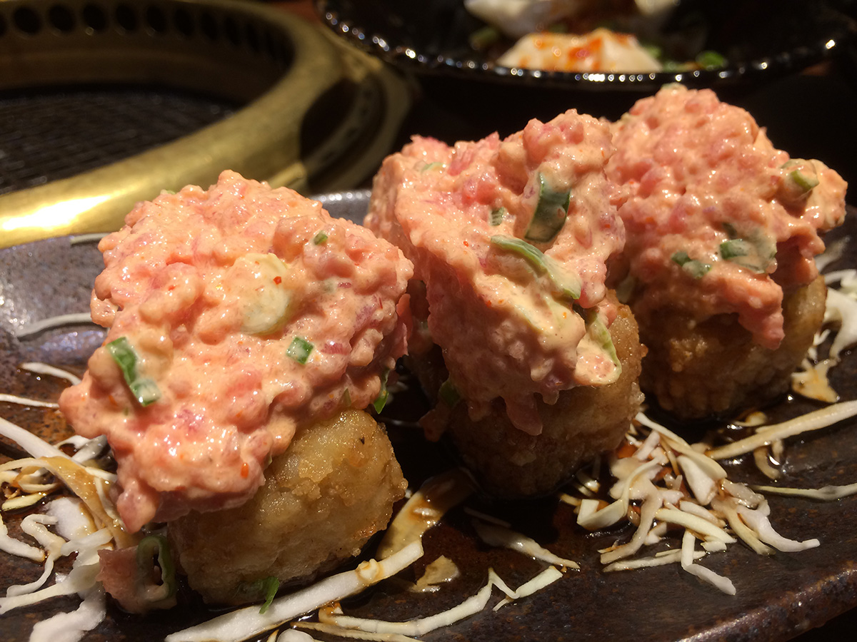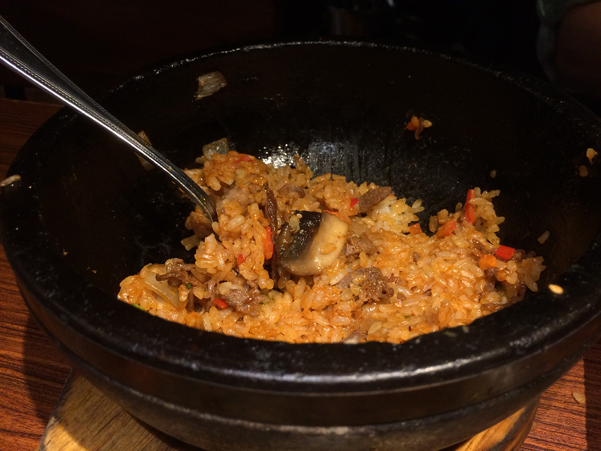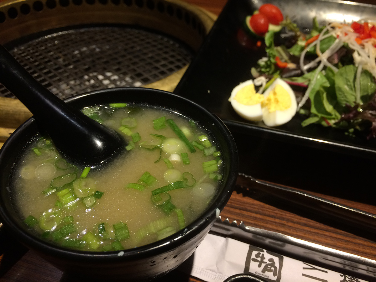 we ended up going to gyu-kaku for dinner. it was pretty packed with a young crowd. it didn't seem like we'd be able to get a table at first but the hostess asked us if we'd be able to finish in 1-1/2 hours and we said yes so we managed to get a corner booth. though not as much a bargain compared to their lunch specials, gyu-kaku did have some worthwhile course specials. we ended up getting the "harvard" special for 2 people which included: large gyu-kaku salad, 2 miso soup, spicy tuna volcano, steamed chili dumplings, sukiyaki bibimbap, toro beef sweet soy, pork belly white soy, shrimp garlic, assorted veggies, harami miso skirt steak, and some s'mores for dessert. all for the bargain price of $52. (japanese/korean barbecue usually is much more expensive).