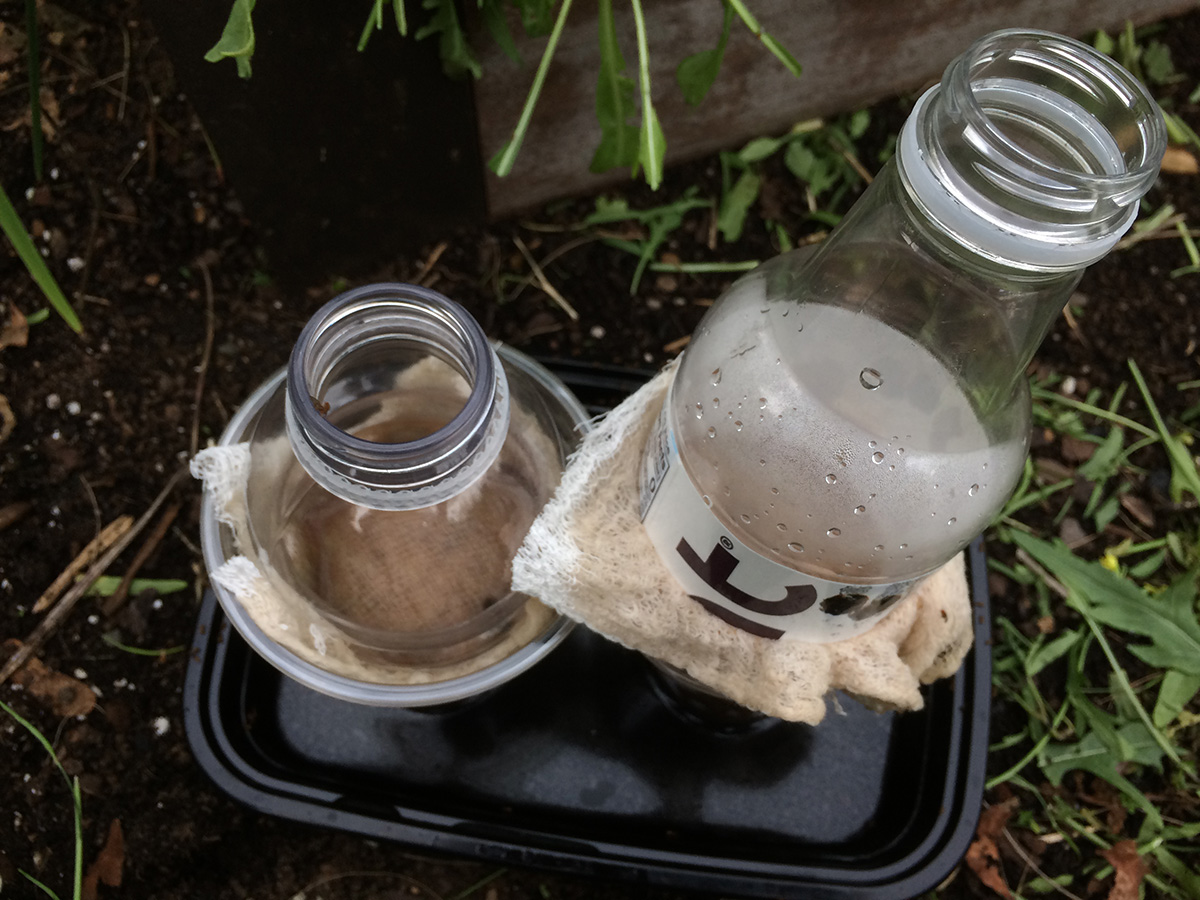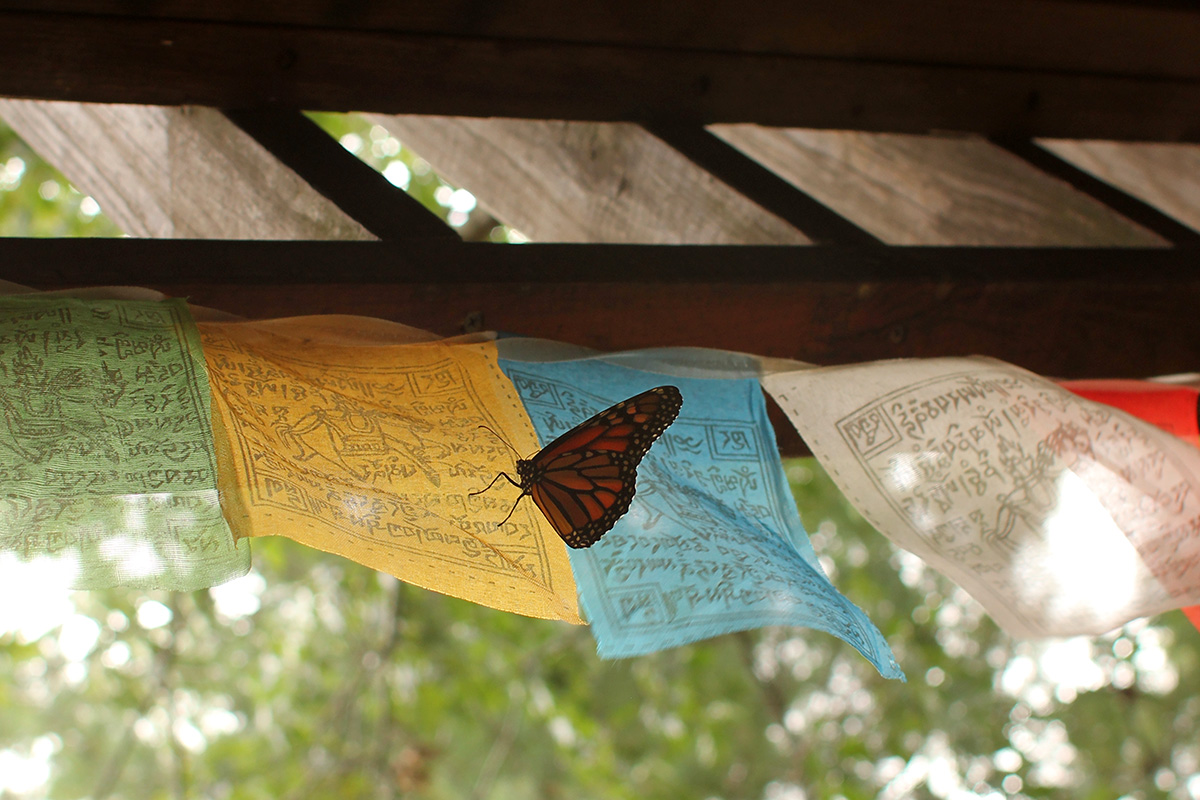 the monarch was still hanging upside on the twig in the jar inside the plastic case when i woke up this morning. after i used the bathroom and came back into the kitchen, the butterfly was down in one corner of the container flapping her wings, trying to get out. i opened the back door and was hoping i'd be able to coax the butterfly onto my hand and set it somewhere outside where i could take some final photos, but the instant i opened the plastic case door, the butterfly made a quick getaway to the door and flew outside. it landed for a few seconds on my tibetan prayer flags before leaving in the windy condition (at least it wasn't raining). and that was it. the end of my monarch raising. it's a thankless task, but i like to think that all the monarchs i've released are all on their way to mexico, that i am in a very small way contributing to the overall monarch population.