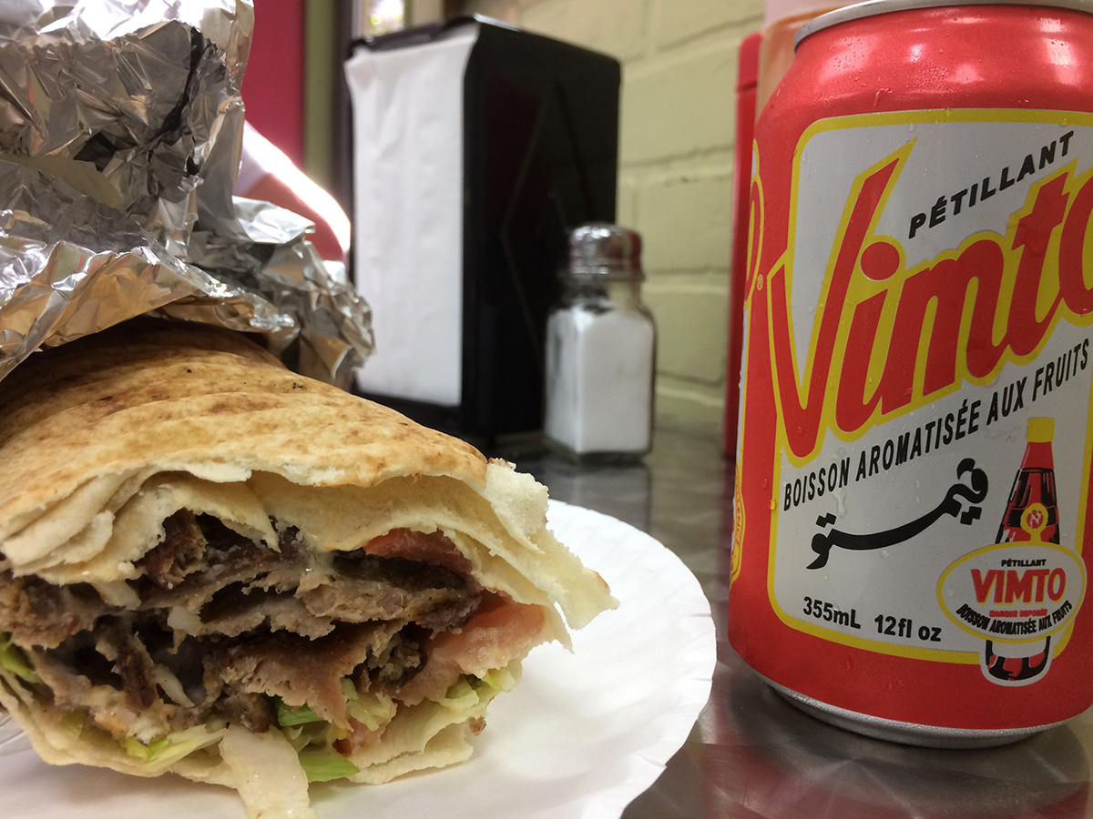 we were there just for an hour before li asked if we could get lunch because he was hungry. i should've told him to eat a bigger breakfast, but i assumed he knew this. it worked out in the end, because i was kind of hungry myself. i'd never left the museum and came back, and didn't realize this was an option, no longer confined to the museum cafeteria, which is often crowded and expensive. around the museum there is absolutely nothing to eat, but if you walk further down the street, there's a QDOBA. and if you walk about 3 blocks down (6 minutes), there's even more selection, directly across the street from the YMCA. i'd done some research before hand and knew there was a shawarma place, which was where we ended up going, $7.50 for a lamb shawarma. li said they have something similar in china, and i told him quite possibly it was the same thing. we also got some vimto soft drinks, which i've never had before, tastes like doctor pepper.