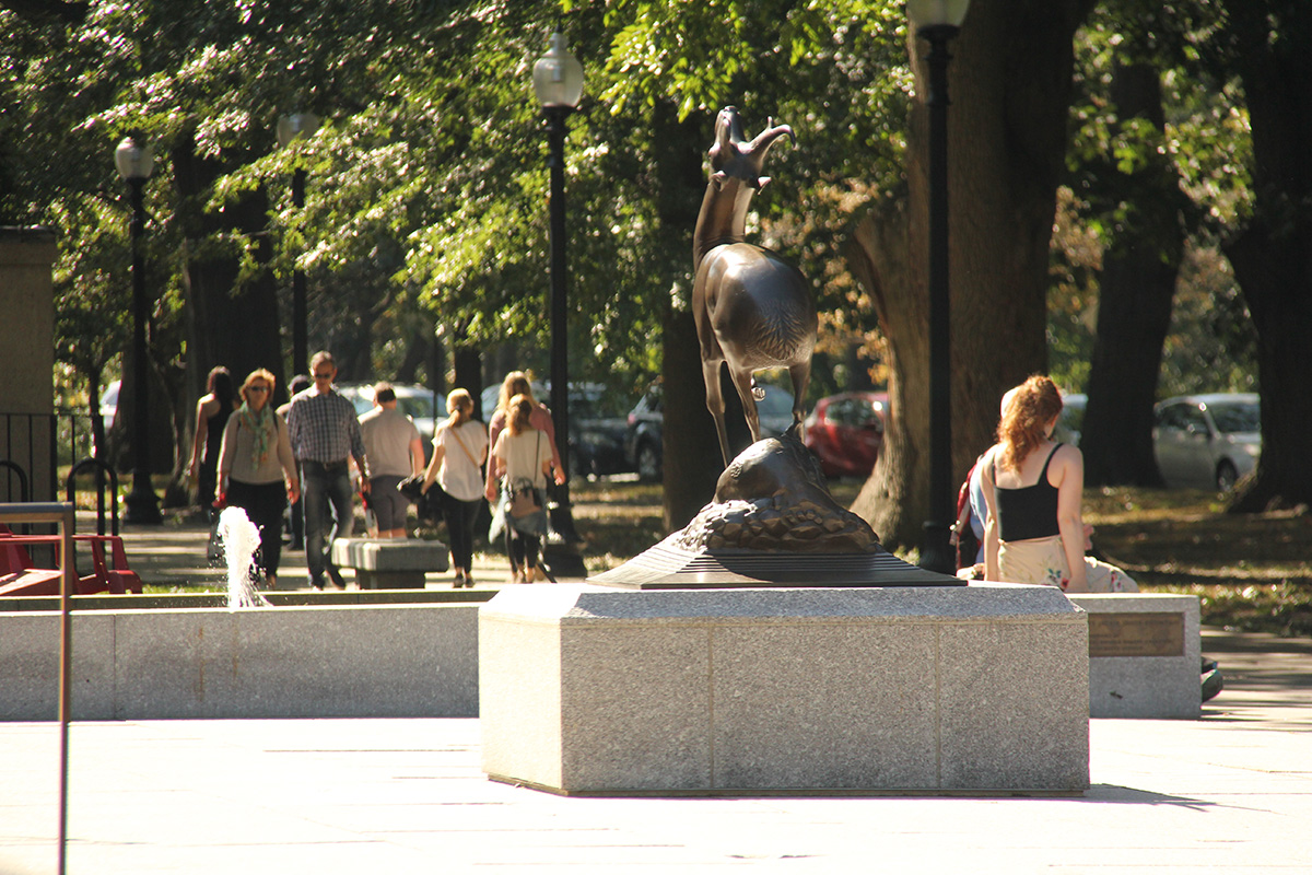 after a 30 minute lunch break we returned to the museum by 2pm. by that point there was a line of people outside the entrance waiting to get inside. we decided to walk around back, where the rear entrance was completely empty. before going in, li wanted to try out the complimentary plastic lawn chairs on the lawn. we pulled the chairs into the shade and vegged out for about 10 minutes. li said the back entrance should be the main entrance. we looked out onto the emerald necklace and the back bay fens, planes in the sky drawing contrails, canada geese honking nearby but we couldn't see them.