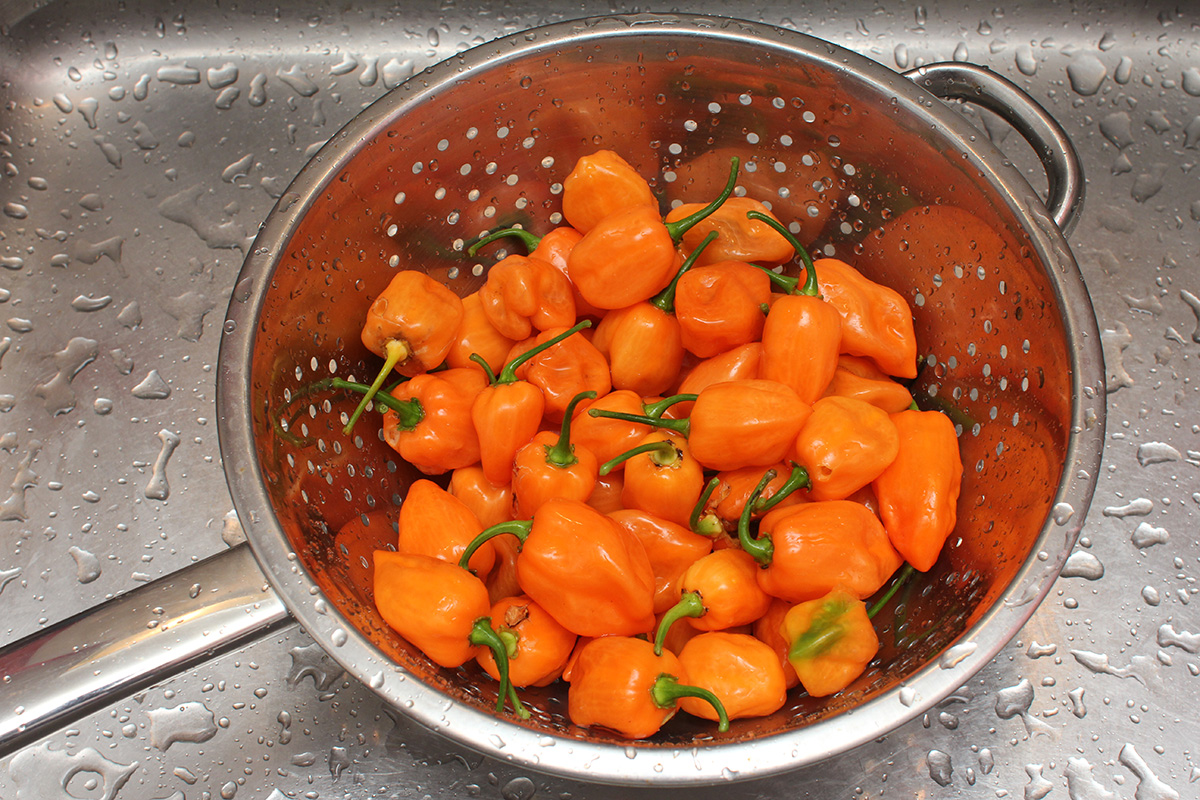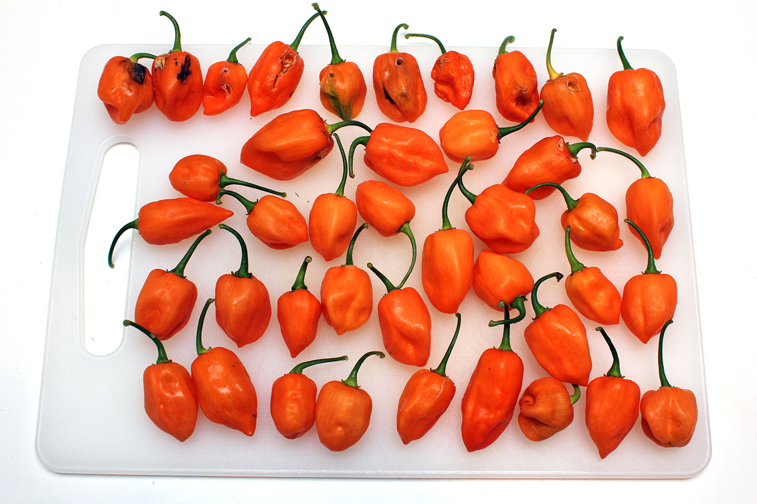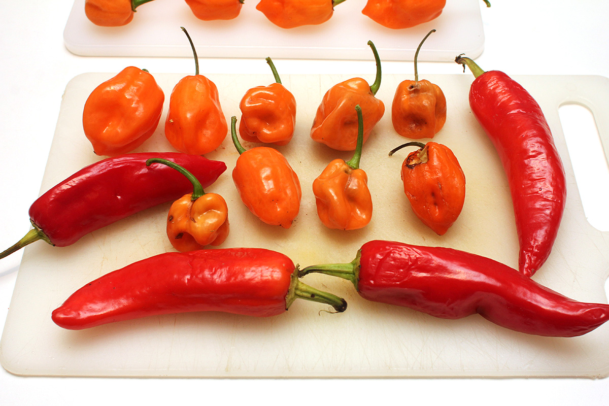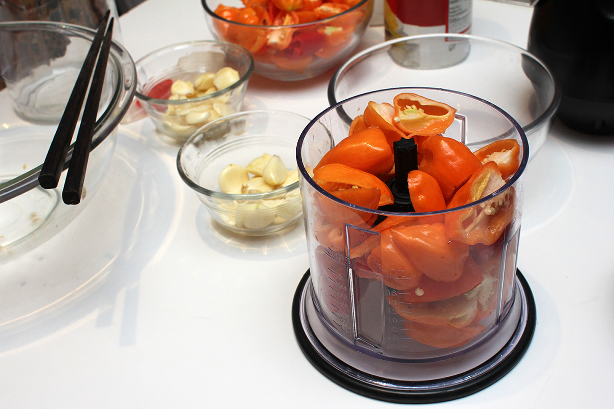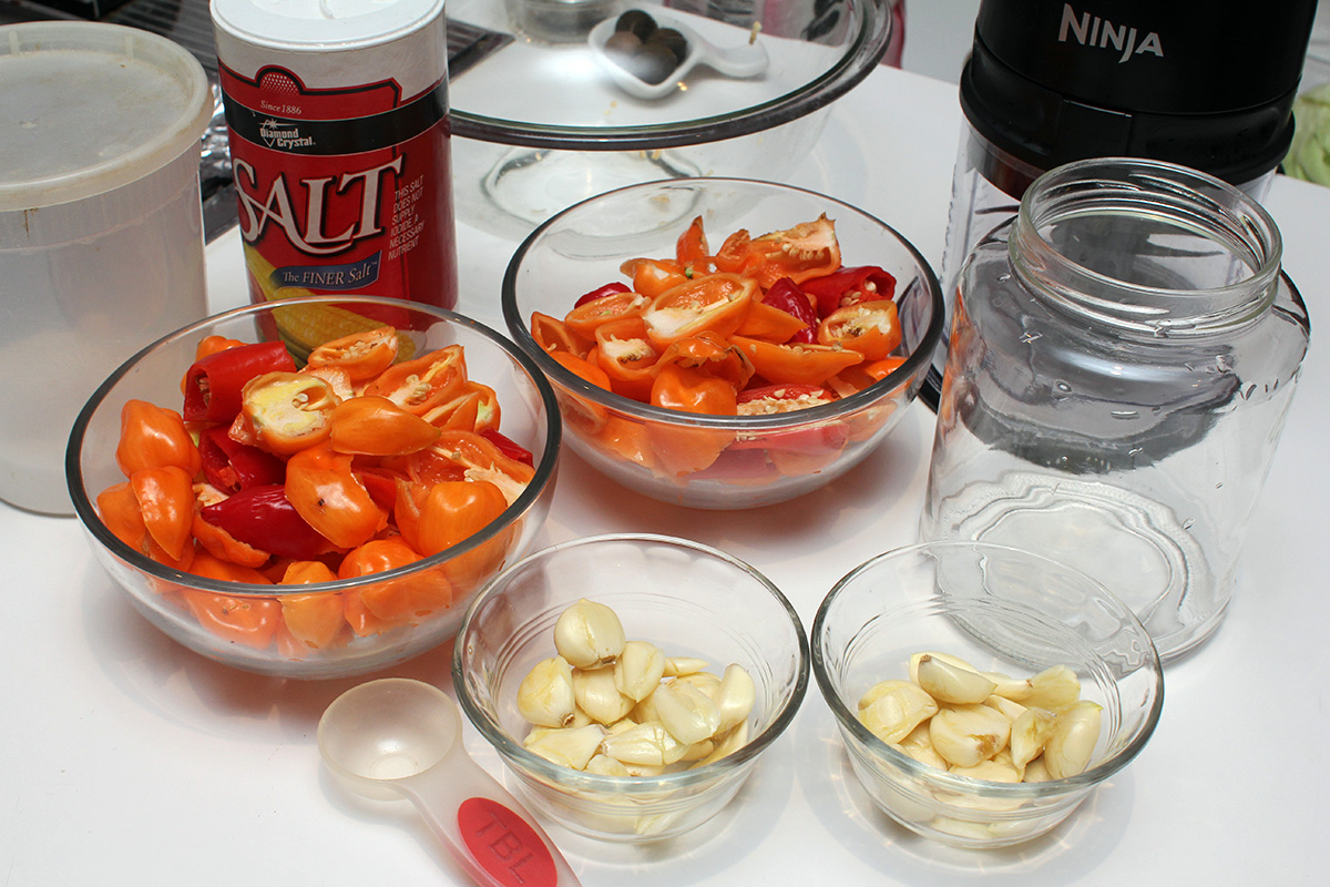 12 oz. orange habaneros (50) 3 oz. red hungarian wax (4) 2 head of garlic (20 cloves) 2 tbsp fine sea salt 2 tbsp white sugar |