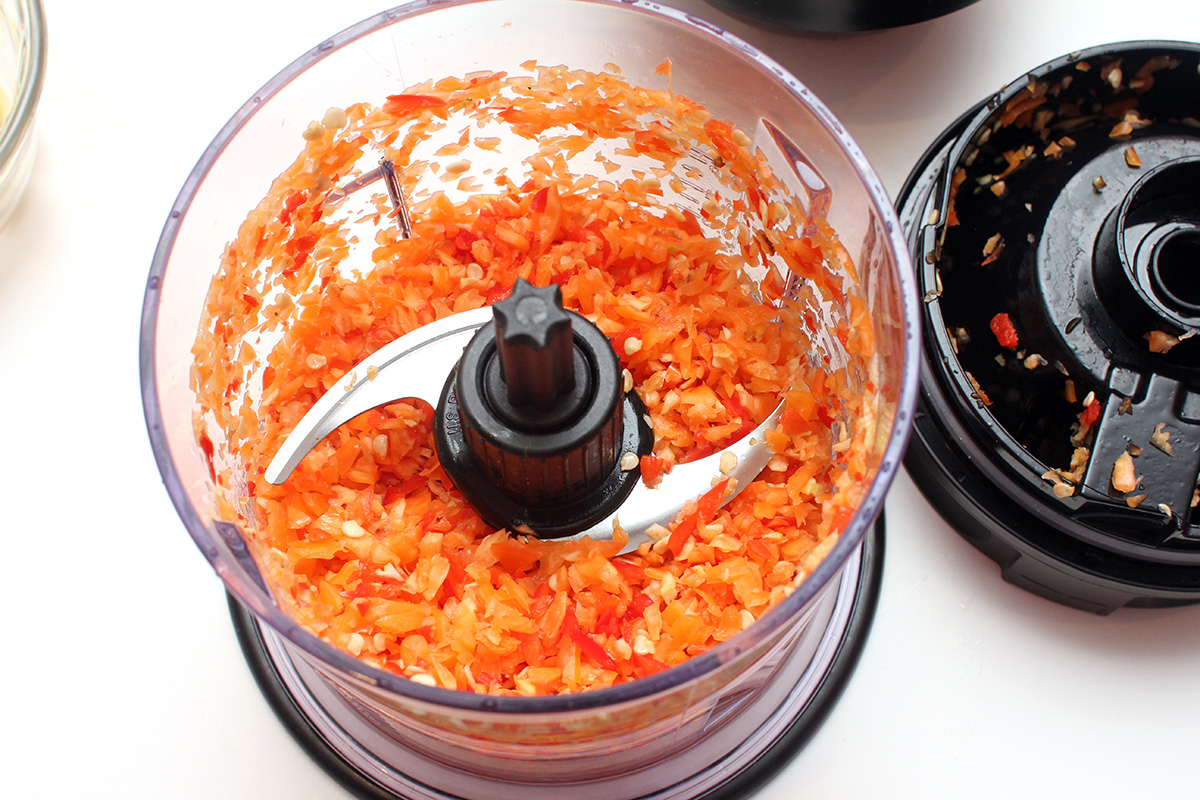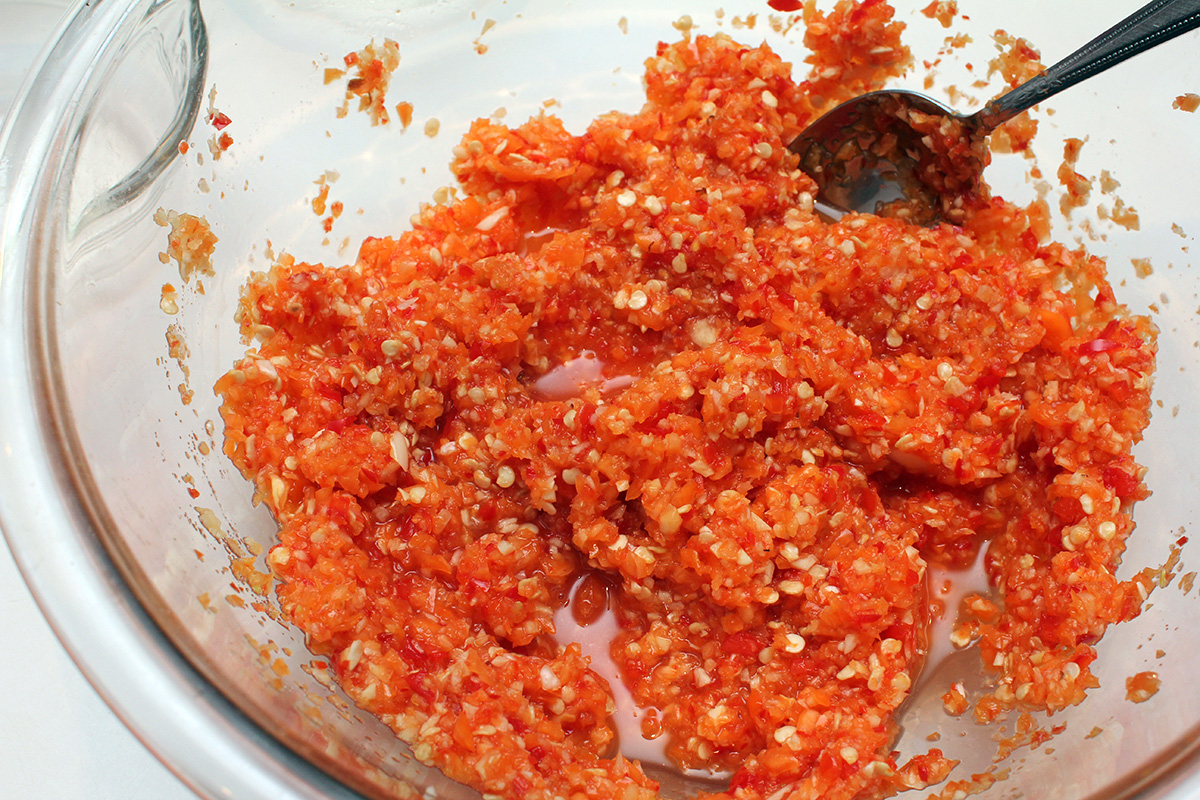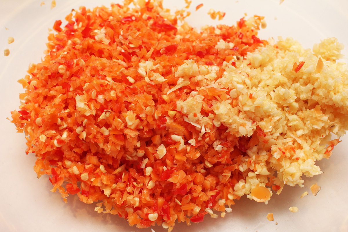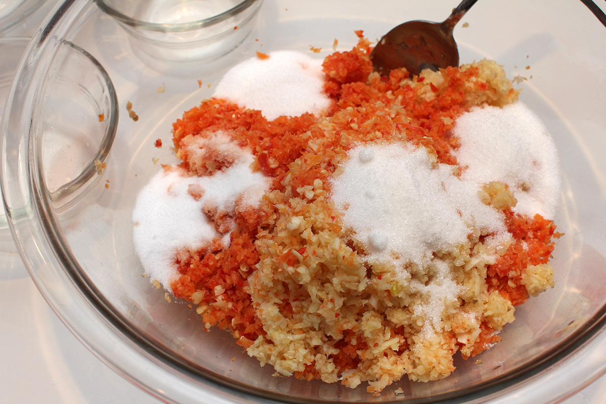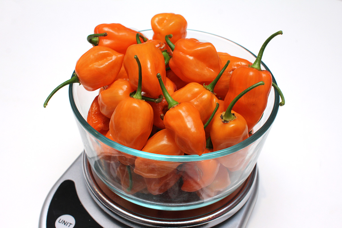 12 oz. orange habaneros (50) 3 oz. red hungarian wax (4) 2 head of garlic (20 cloves) 2 tbsp fine sea salt 2 tbsp white sugar |