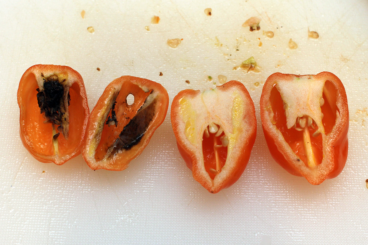 as for habaneros, i only managed to collect half a dozen at most. they weren't in very good shape and a few had insect damage. fortunately i had a lot of habaneros from the belmont backyard garden.