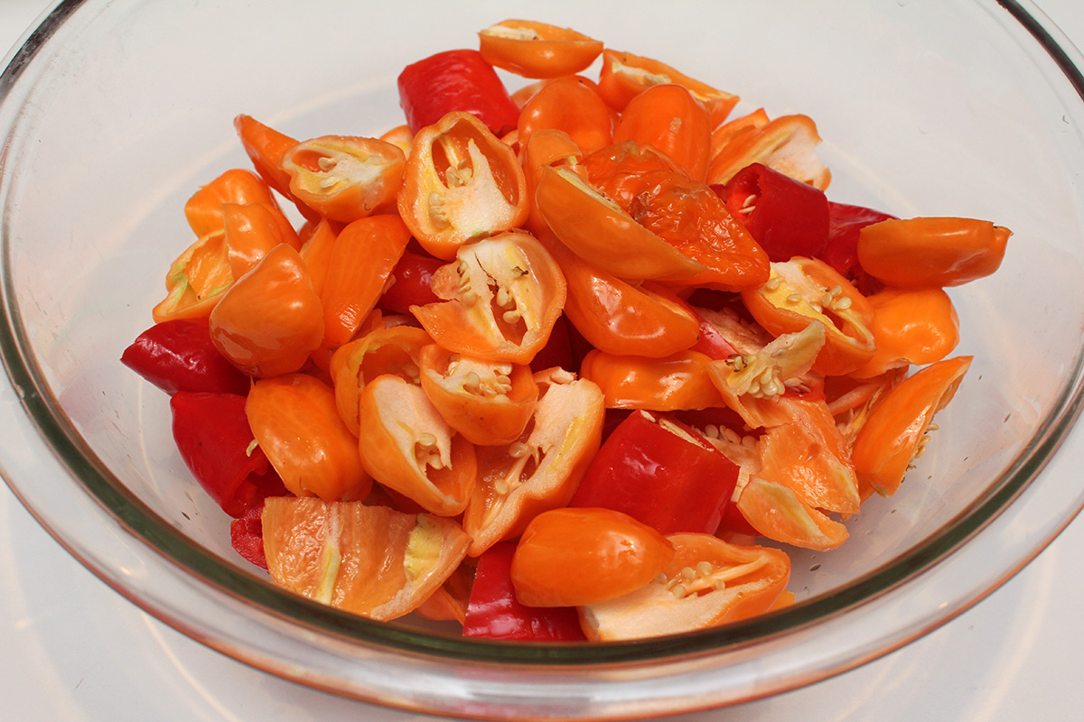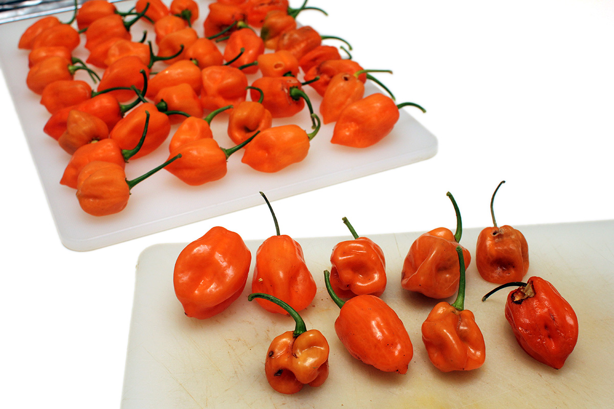 after washing them, i pulled off the green stems and sliced the peppers in half. i also tossed in 4 hungarian wax peppers which were formerly yellow green but changed to orange and now red. some of the habeneros were bad, a few with insect holes or slug damage, then grow black mold on the inside; those i threw away. the habaneros didn't seem that hot. there was none of that characteristic habanero smell unless i put my nose up against it. i licked one of the halves and felt nothing for the first few seconds until suddenly my tongue was burning. i left the peppers to dry.
