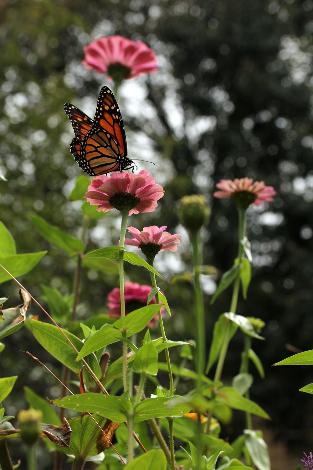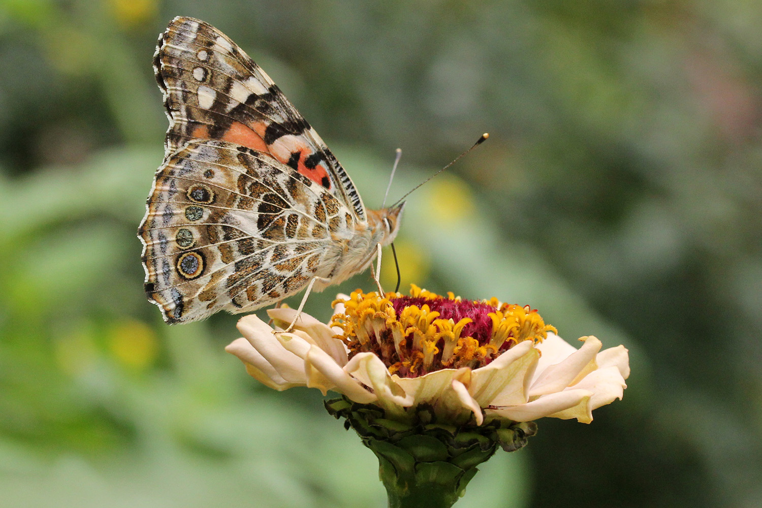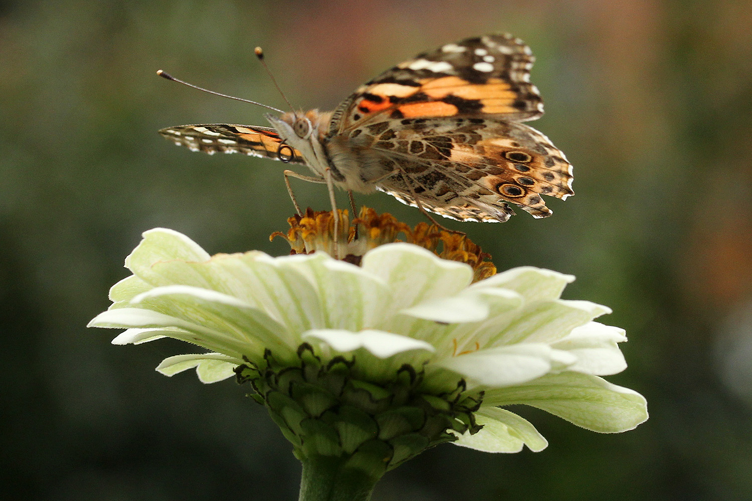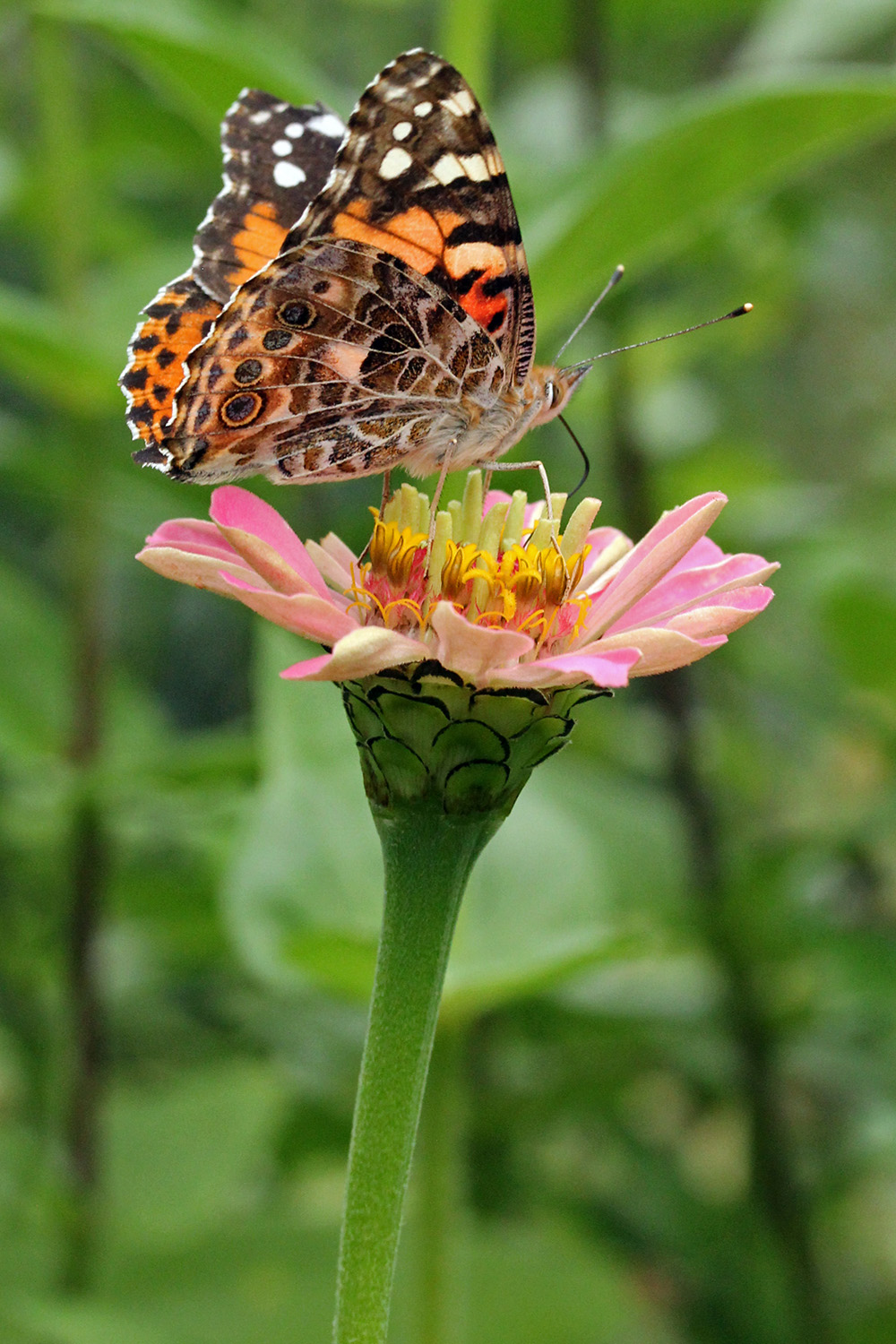 elsewhere, butterflies were busy feeding now that the rain had stopped. there was a monarch taking advantage of the numerous garden flowers. it seems like all the monarchs i've seen have been females, and this one was no different. i see them a lot this season, which hopefully is sign of population rebound. there were also a few painted ladies (Vanessa cardui, the cosmoplitan, not the american version virginiensis). i find them rather dull but the prettiest part of the painted lady is the underside, where there's a flourish of blue and green eyespots and patches of peach on the upperwings. i noticed the monarch feed with wings closed, but the painted lady preferred to feed with wings opened.