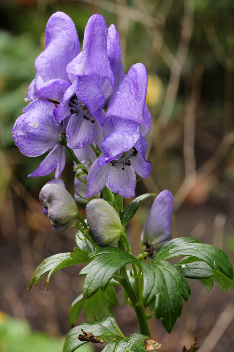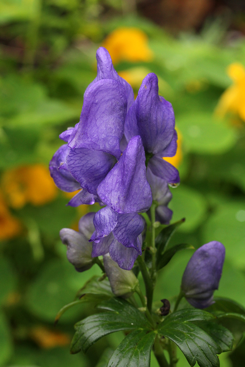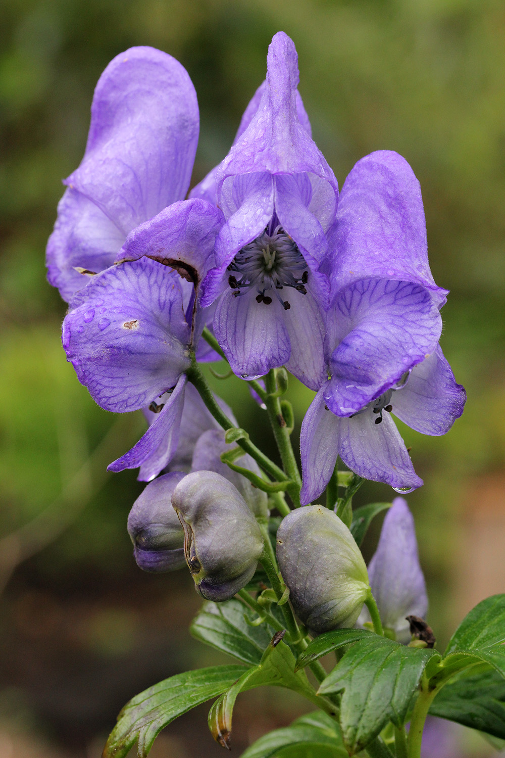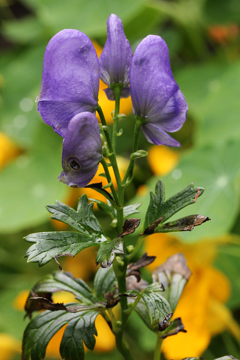 i went down to the community garden in the late morning to collect habaneros for the hot sauce i'd be making later today. it'd rained earlier, so the garden was still a little damp. i brought my dSLR because i had a feeling that my the monkshoods had bloomed, which they did. monkshood is deadly poisonous, and every year people die from accidental ingestion. so it surprised me to see that a few flowers had holes in them, either insect or slug damage (my money is on slugs), which seemingly are impervious to the effects of aconitine poison. monkshood flowers are quite distinctive and no other flowers look like them. maybe some of the flowers will have enough time to mature and produce seeds, which i'll try to grow indoors.