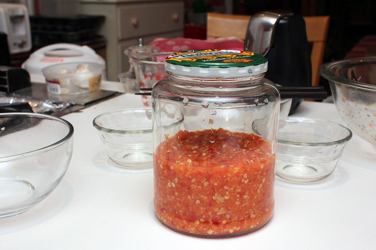 i gave it a taste test, sweet, salty, spicy. i'll let it ferment for a few weeks, let the flavor gain some complexity. even though i used less baijiu (1/8 cup instead of 1/2 cup), the hot sauce was more liquidy compared to last time. i'm not sure why that is, maybe because i used fresh habaneros picked from the garden just last night.