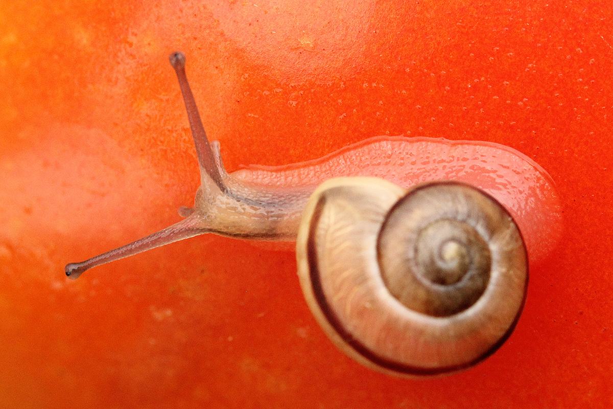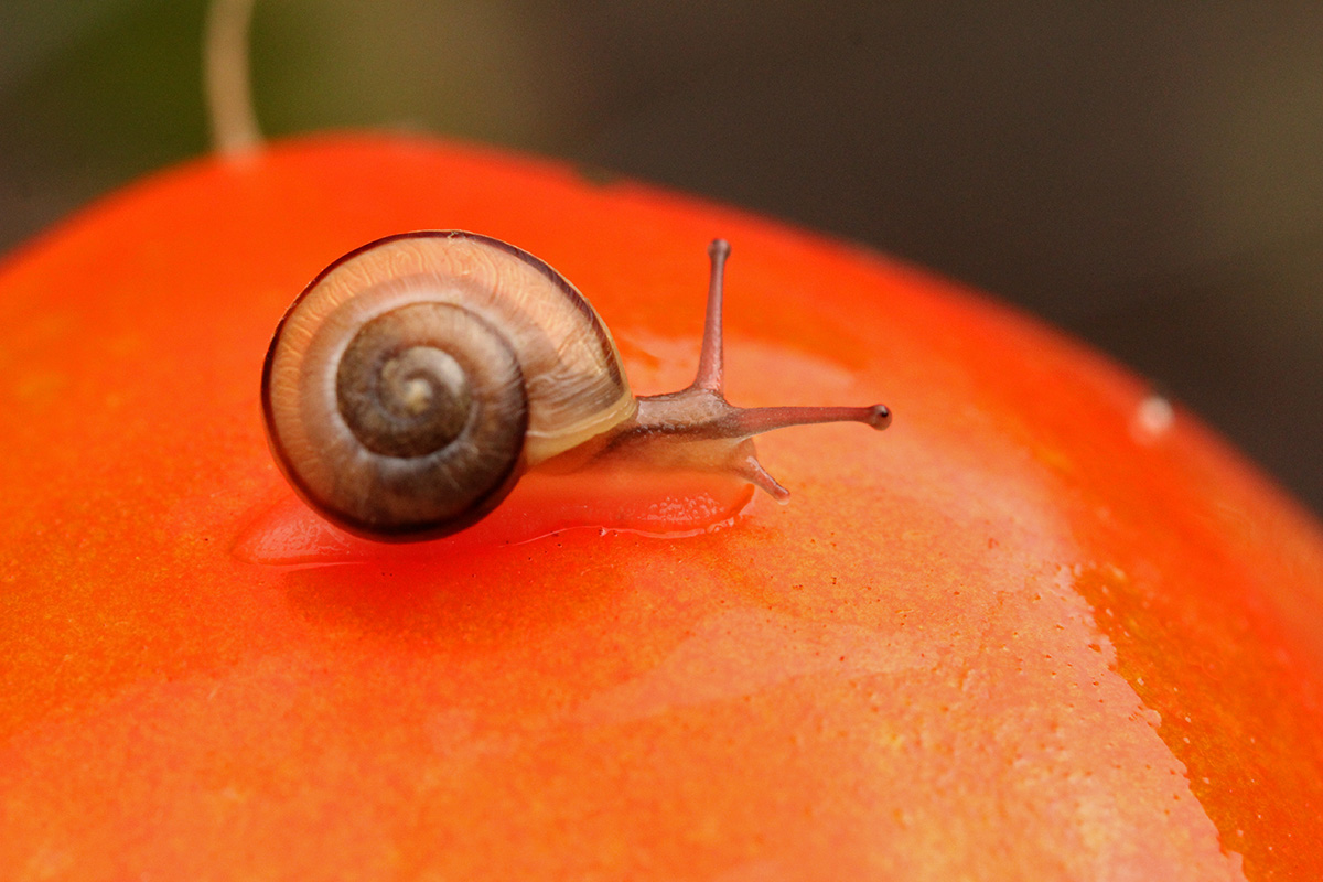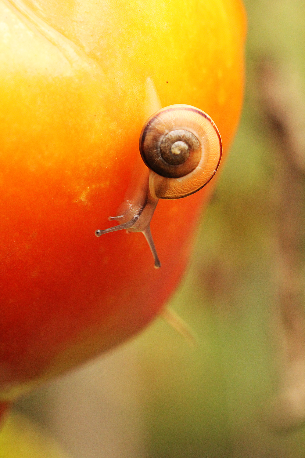 the period after a rainstorm is a great time for garden photography. i noticed a snail crawling on one of my rotten tomatoes. snails are fascinating (i prefer them over slugs) but when they're in my own garden i hate them with a passion and always kill them when possible. a few things i never noticed about garden snails: they're actually kind of translucent, not only their body but the shell as well. the eyes are located on tall stalks, while down below are a pair of antennas. i ended up tossing the snail as well as the tomato.