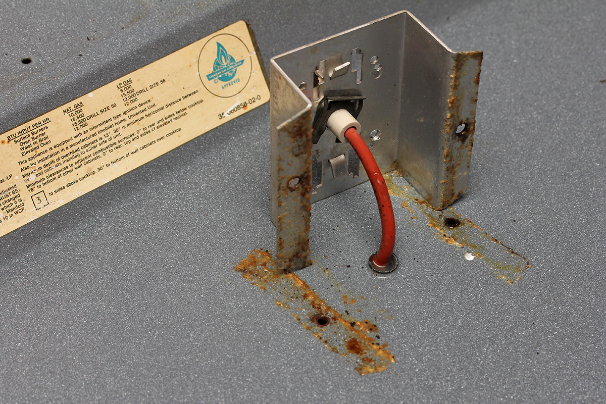 i was planning on making the last of my grilled cheese and ham sandwich for lunch when i noticed a pool of liquid on the lower right most stovetop. the aluminum foil oil shield i placed there was looking a bit tattered so i decided to replace it.