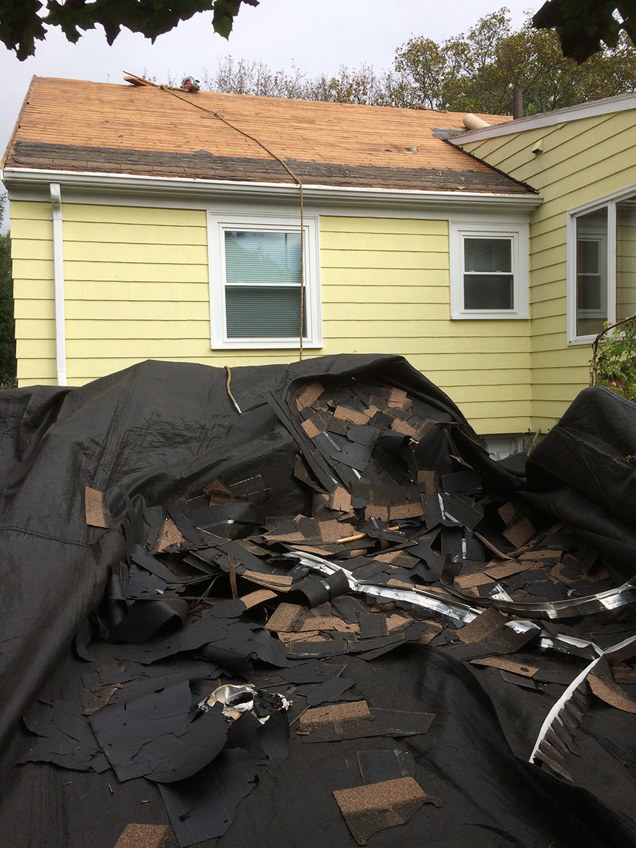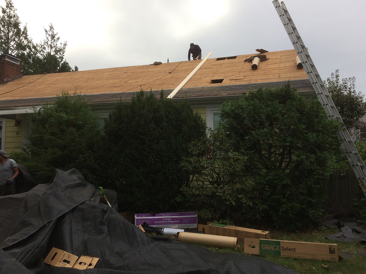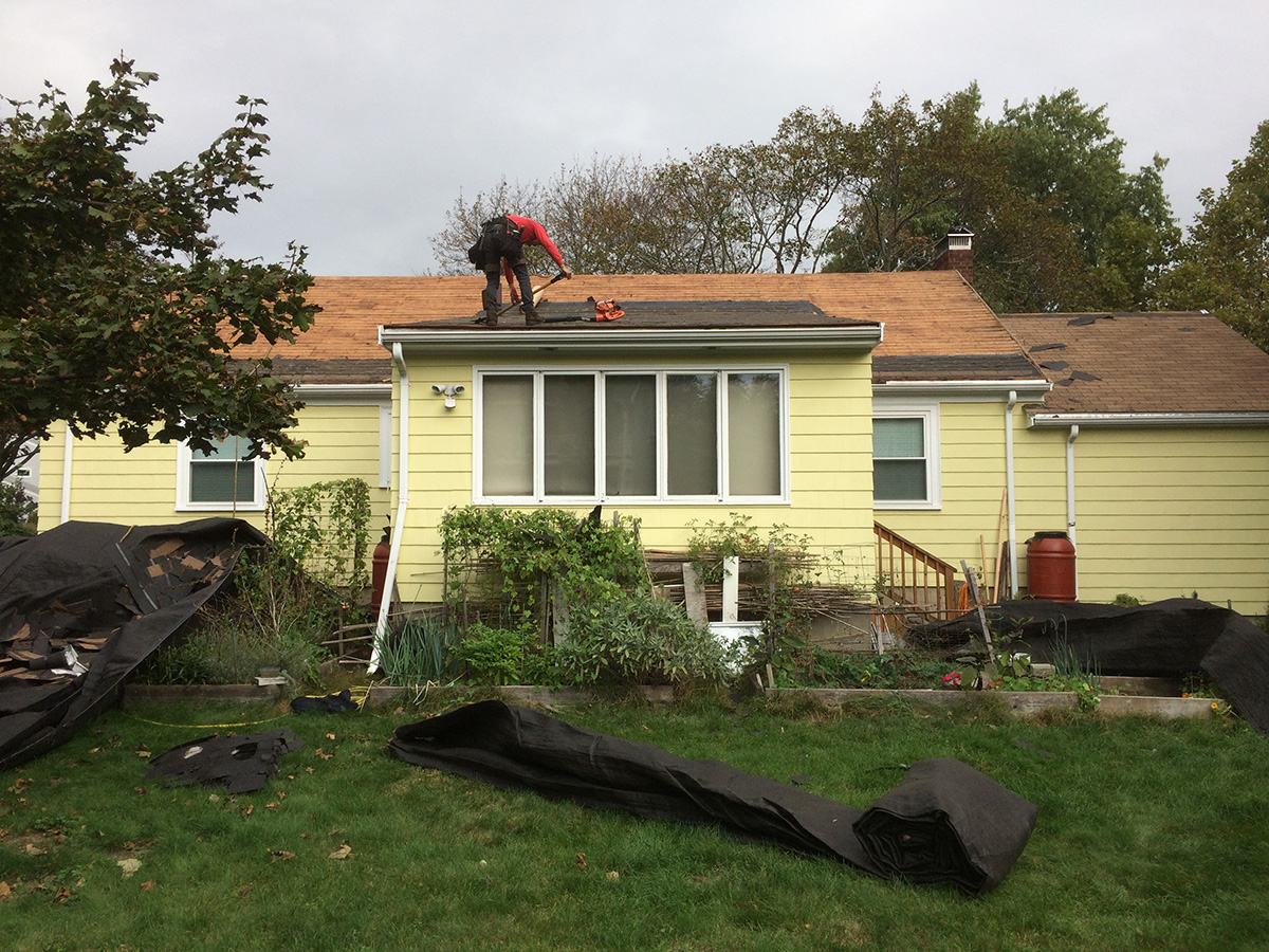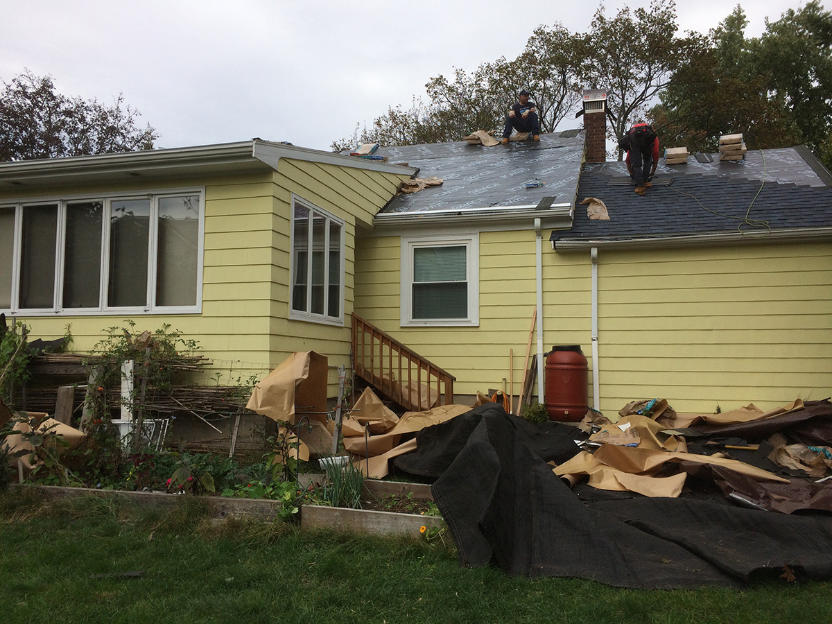 my father went back to the cafe around 10:40am. the sounds changed by that point. instead of ripping, it was occasional hammering and thudding, as they began moving packages of new shingles onto the roof. later it was more hammering as they began to layer the shingles.