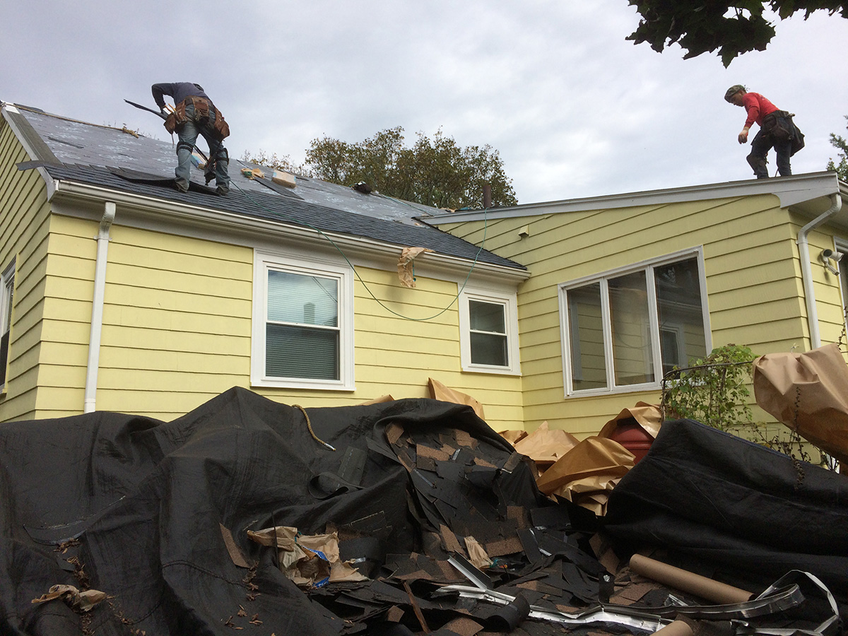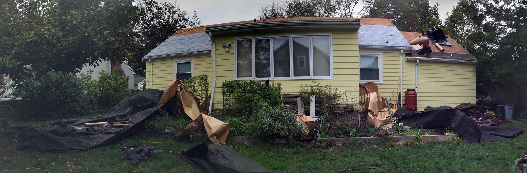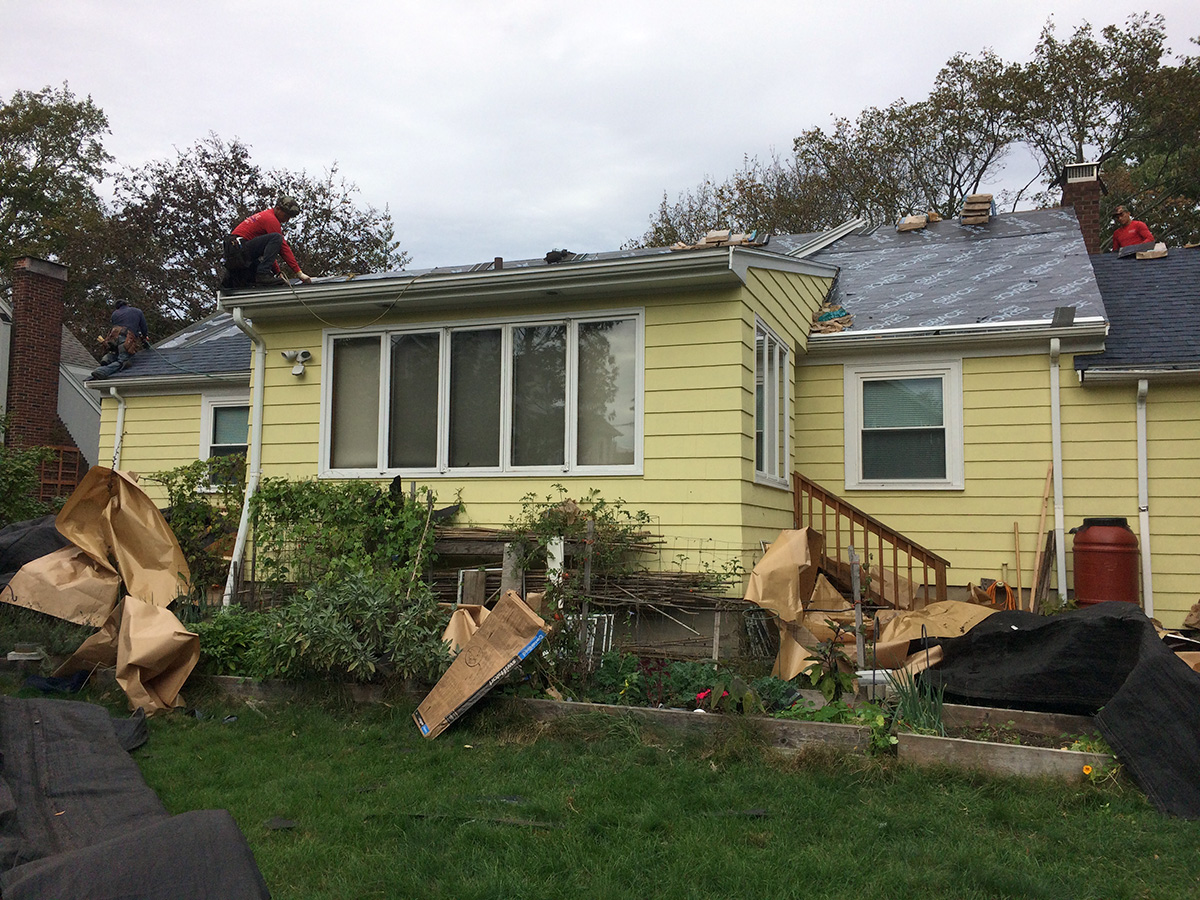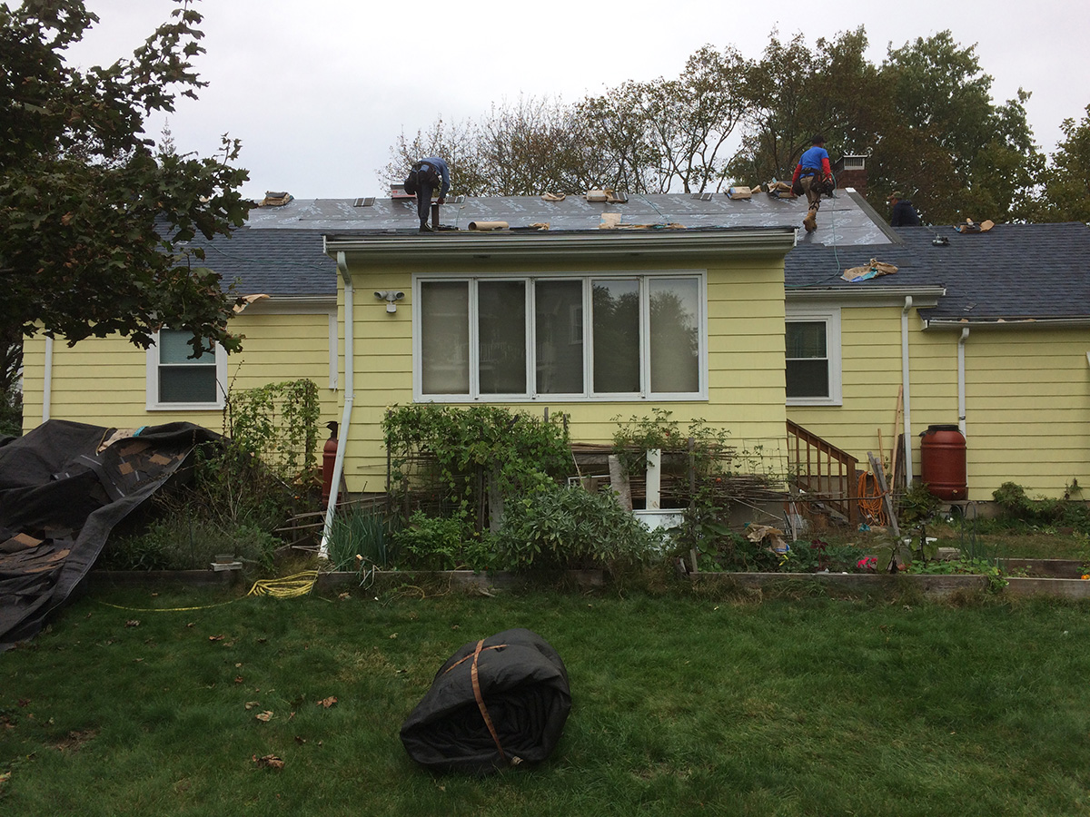 my father went back to the cafe around 10:40am. the sounds changed by that point. instead of ripping, it was occasional hammering and thudding, as they began moving packages of new shingles onto the roof. later it was more hammering as they began to layer the shingles.