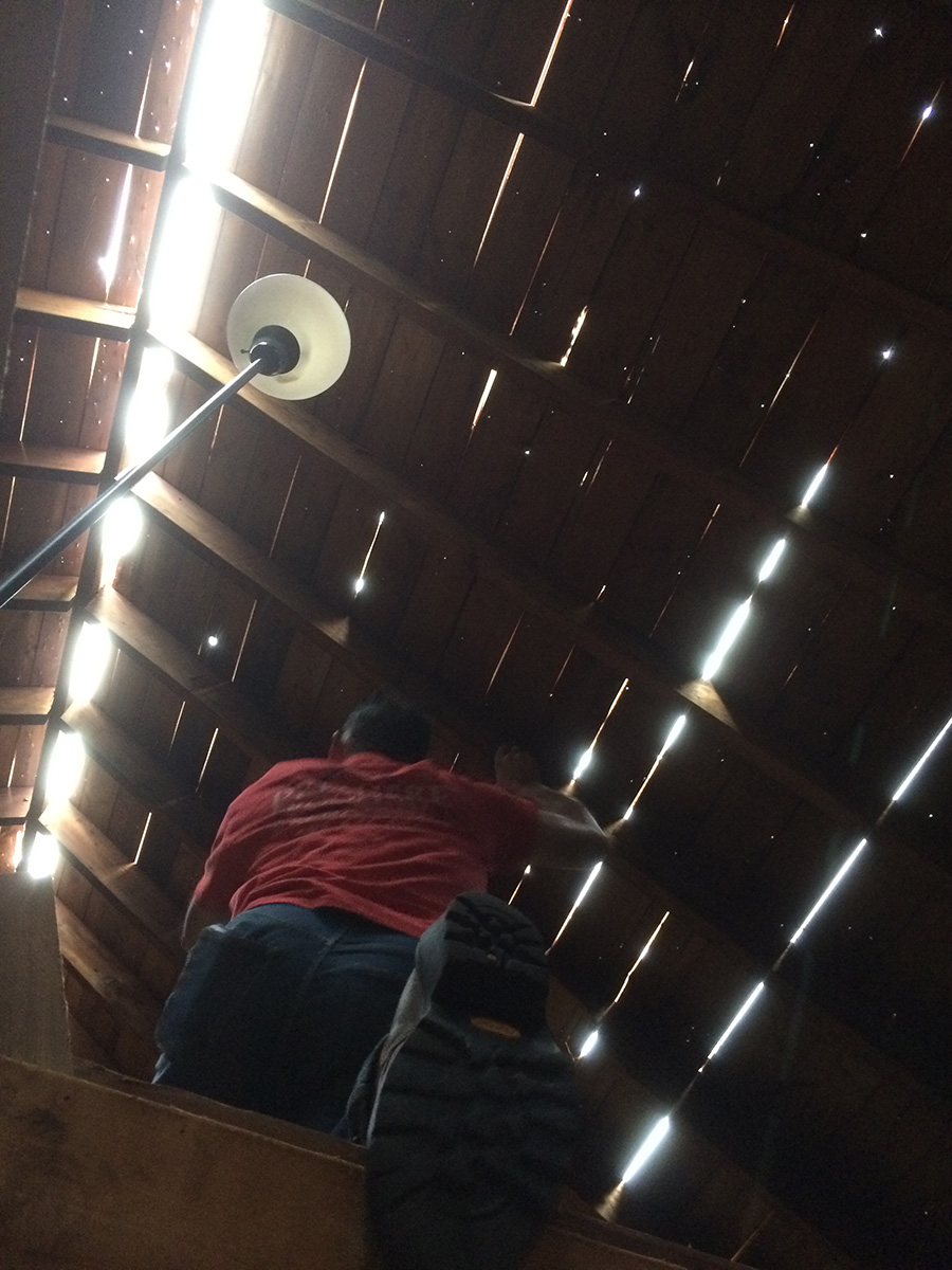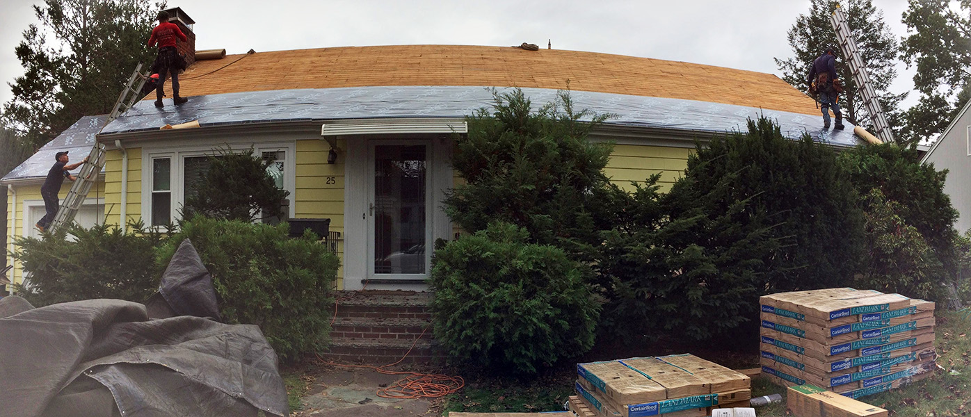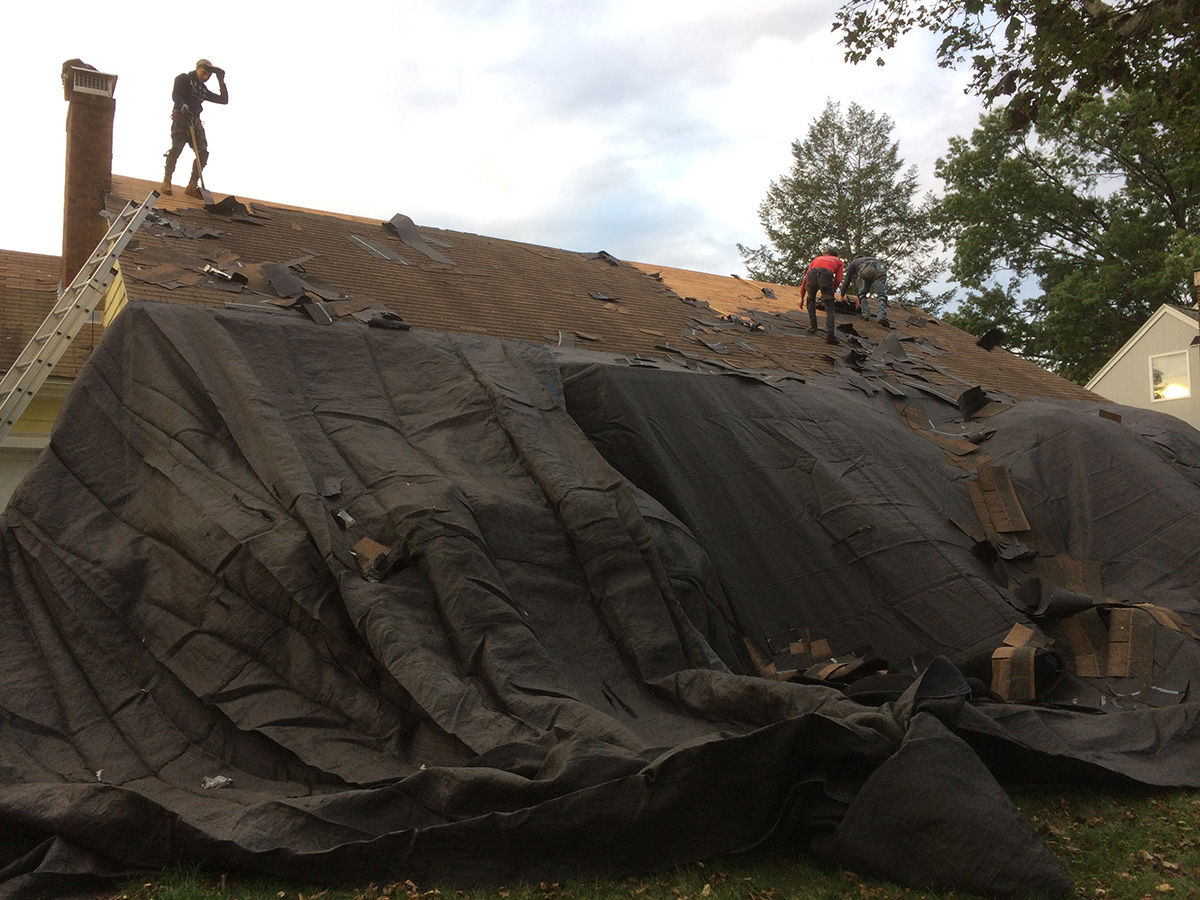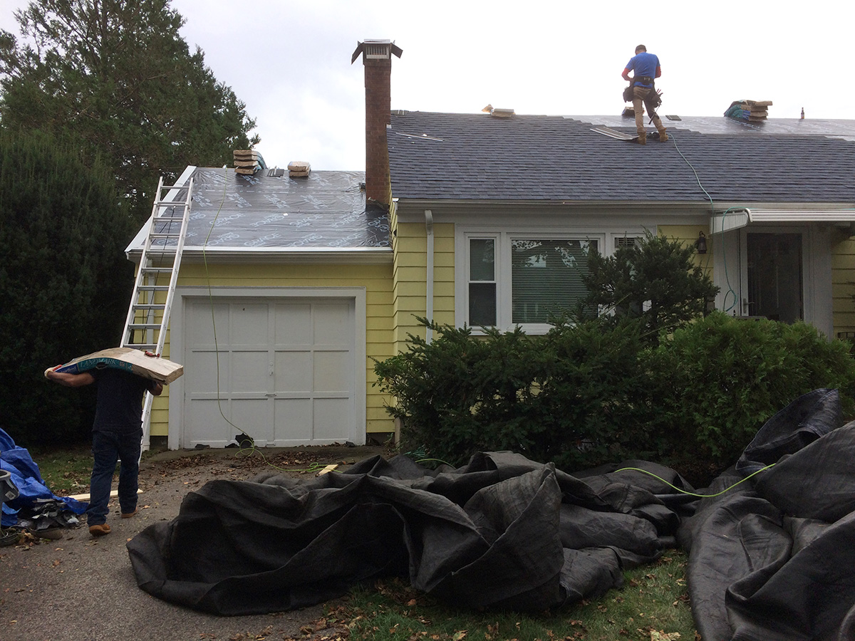 my father went back to the cafe around 10:40am. the sounds changed by that point. instead of ripping, it was occasional hammering and thudding, as they began moving packages of new shingles onto the roof. later it was more hammering as they began to layer the shingles.