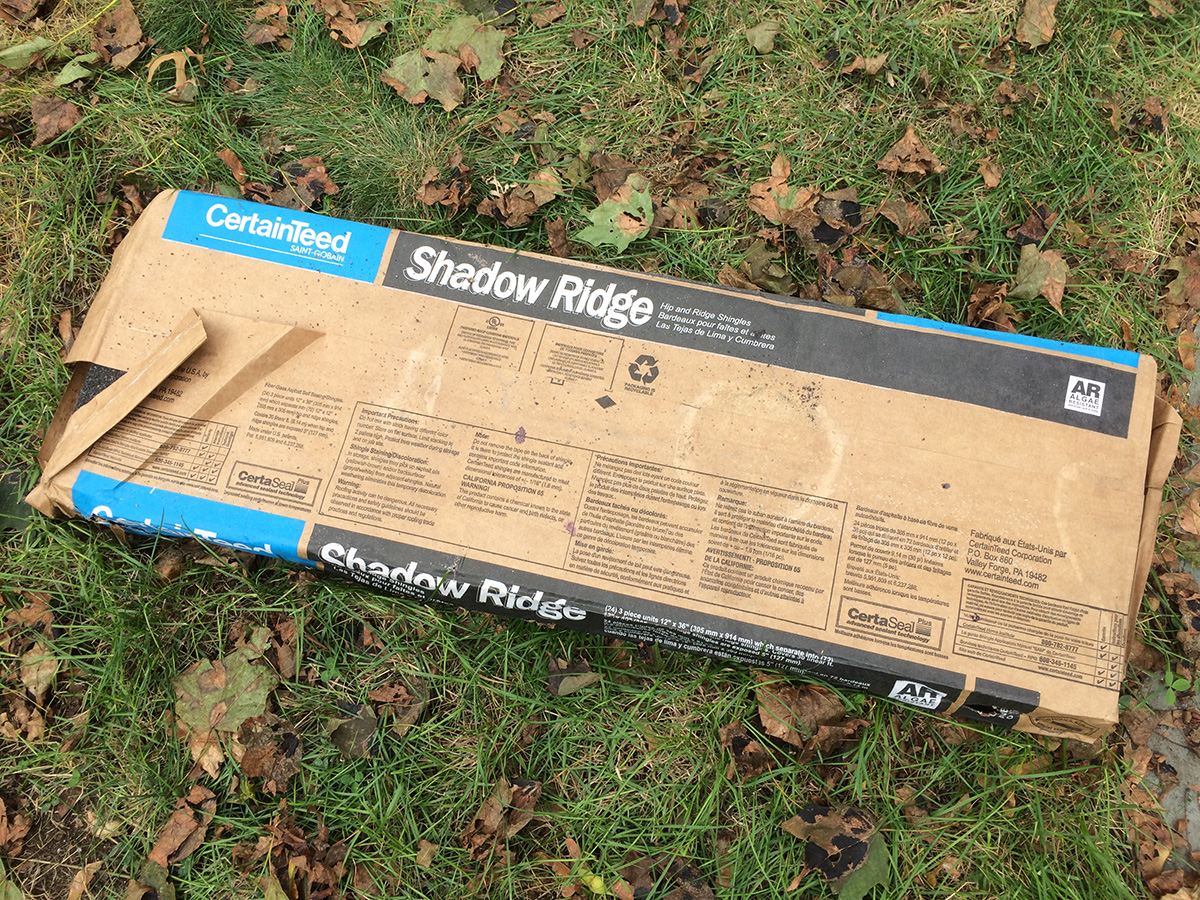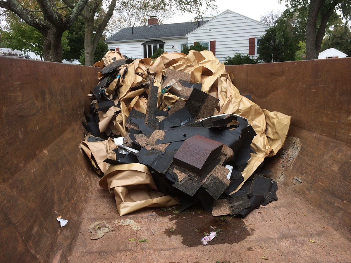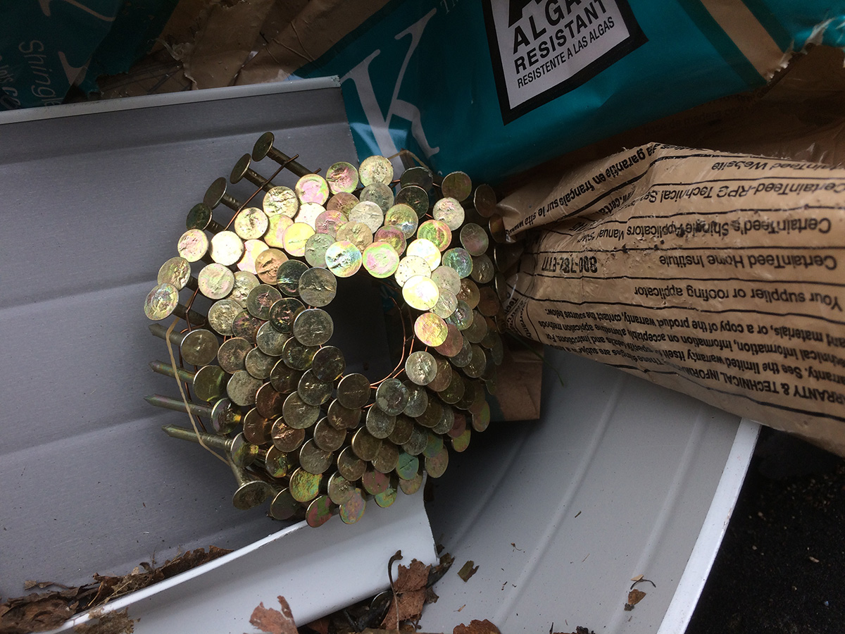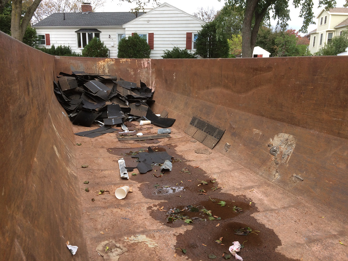the moment they left, my father and i went out with gloves on to toss some stuff into the large dumpster still sitting out on our front lawn. the contract specifically said we weren't allowed to toss anything into the dumpster, but we'd paid for it, and figured it was our right to throw away some junk, which was mostly construction material anyway, like broken windows and damaged wooden fencing, nothing hazardous or chemical. but just to cover our tracks, we sort of tried hiding our additions with some shingles, but it was still pretty obvious, so we ended up not bothering with subterfuge. the workers also left behind an unopened bundle of shingles as well as a box of coiled nails.