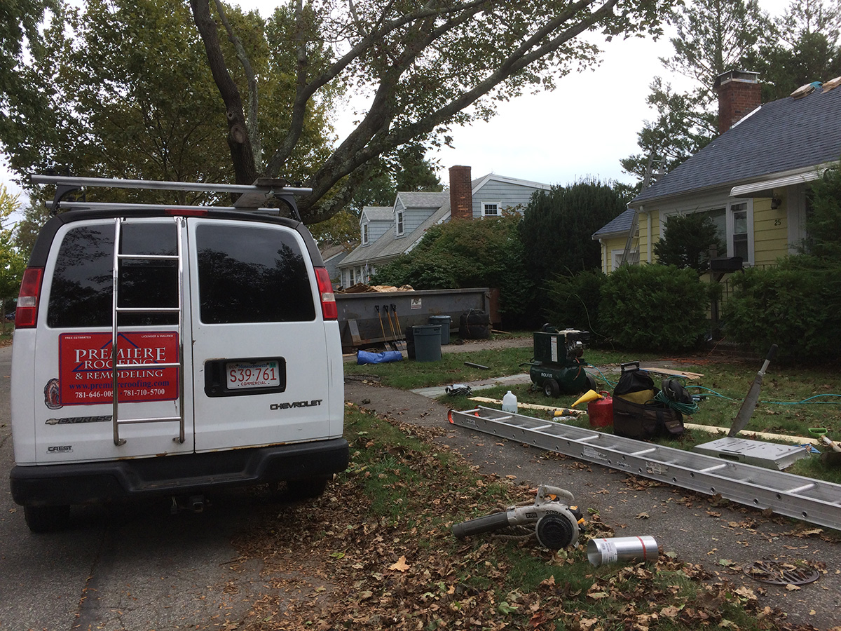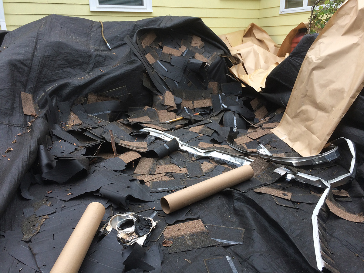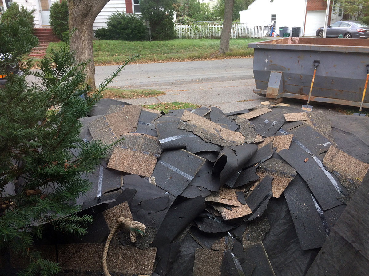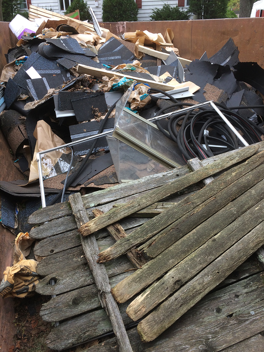 the moment they left, my father and i went out with gloves on to toss some stuff into the large dumpster still sitting out on our front lawn. the contract specifically said we weren't allowed to toss anything into the dumpster, but we'd paid for it, and figured it was our right to throw away some junk, which was mostly construction material anyway, like broken windows and damaged wooden fencing, nothing hazardous or chemical. but just to cover our tracks, we sort of tried hiding our additions with some shingles, but it was still pretty obvious, so we ended up not bothering with subterfuge. the workers also left behind an unopened bundle of shingles as well as a box of coiled nails.