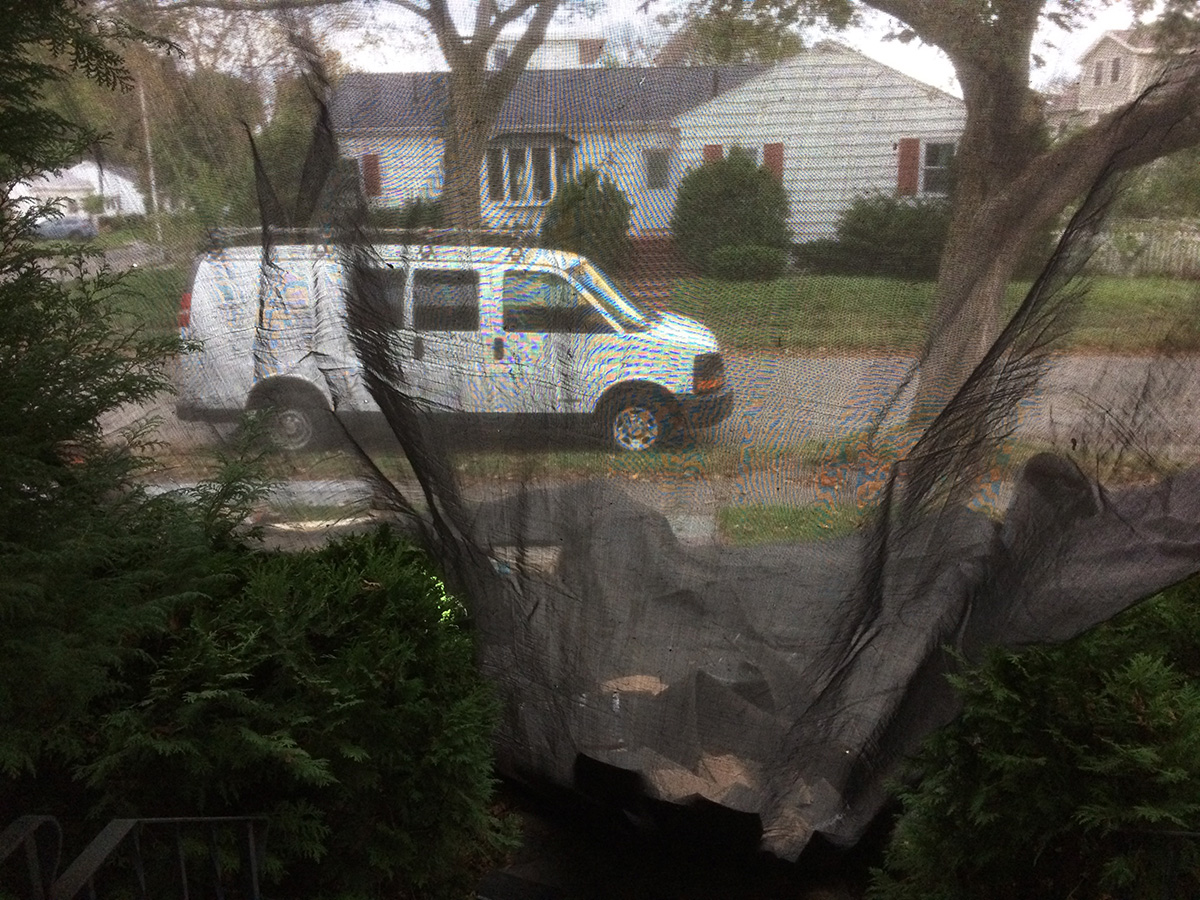around 1pm there was a brief lull as the hammering stopped and the workers ate lunch. around 1:30pm work began anew, with 3 guys on the roof putting down shingles while the other two either brought up more bundles of shingles or were cleaning up. carrying up the shingles was especially strenuous, as each bundle easily weighed anywhere between 60-80 lbs. throughout the day every now and then i'd see the manager in his red truck pulling up to the house to inspect the work before leaving again, perhaps to a different job site. he reminded me of titus' construction worker boyfriend mikey (mike carlsen) on kimmy schmidt.