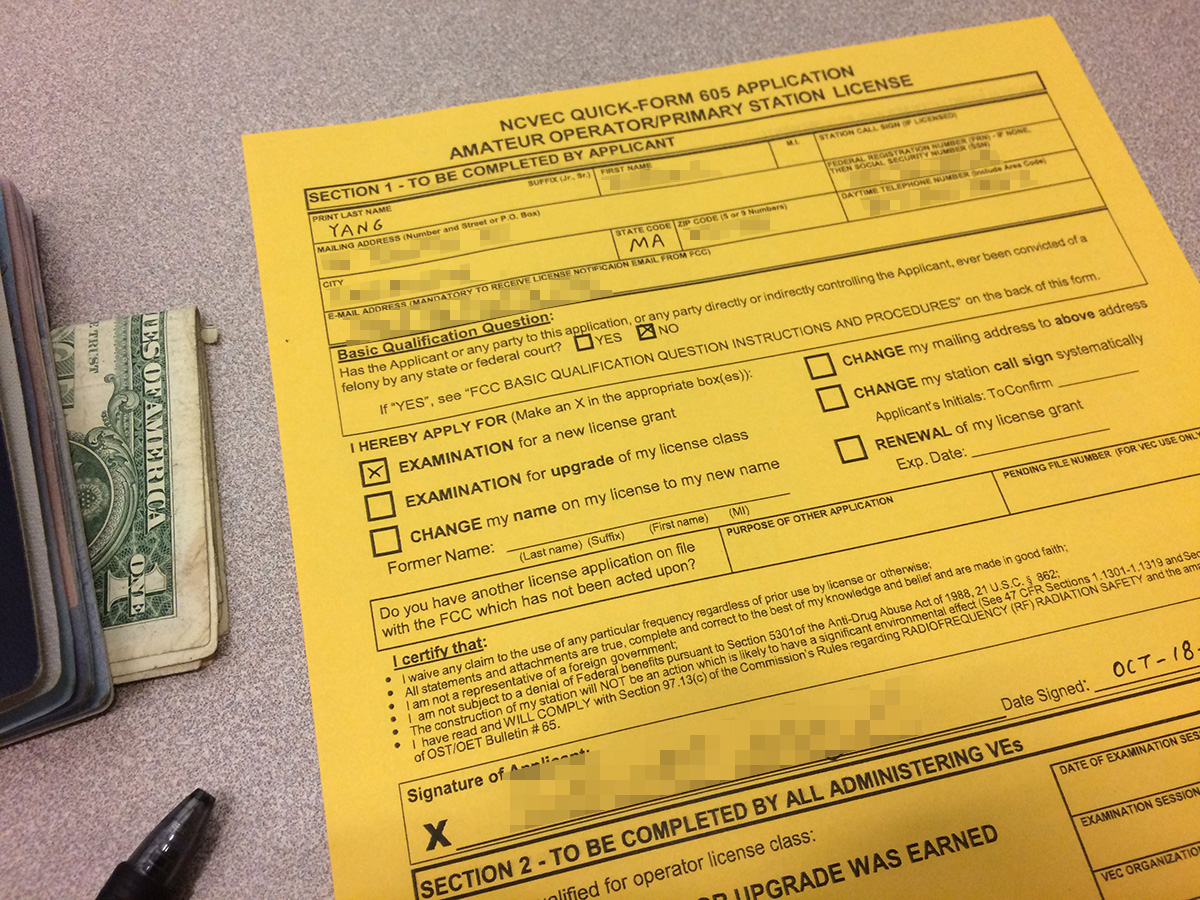 there were 3 test administrators, an older man, a middle-aged man, and a woman in an electric wheelchair. they passed out a 605 form for us to fill in, and then one by one we went up to show our id, pay our $14 (in cash) and get our exam. had i known this earlier i would've sat in front of the classroom instead of in the back. because of that, i didn't get my test until 40 minutes later, when people who had already gotten their test already were nearly finished with the exam. everyone was here for the technician license (1st level) except for one person who was here for his general (2nd level).