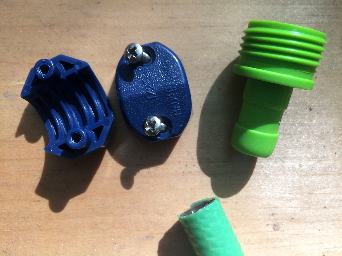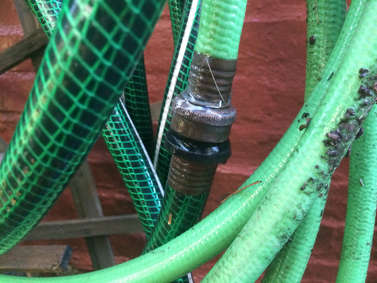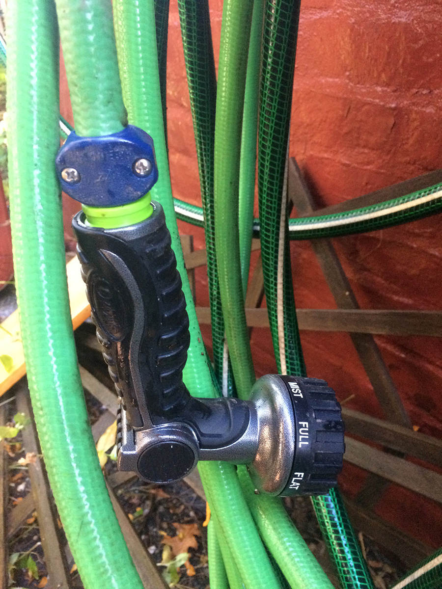 inserting the plastic nozzle in the cut hose took some effort. i had to wear rubber gloves so i could get a good grip and slowly twist and push the nozzle into the hose. afterwards i screwed the clamp into place. i turned on the water but it was still leaking! but not from the hose but rather the plastic sprayer, which is a piece of crap anyway. i screwed on the heavy duty metal orbit sprayer from my parents' place and it worked perfectly. however, i noticed a leak at the other end of the hose, which means that end has to be repaired as well. at this rate, it might be cheaper just to buy a new hose rather than trying to repair it. but in the spirit of conservation and not simply throwing something out because it doesn't work well anymore, fixing the hose is still the right thing to do. of course all this effort will go unnoticed by my upstairs neighbors, but i do these things for my own personal satisfaction.