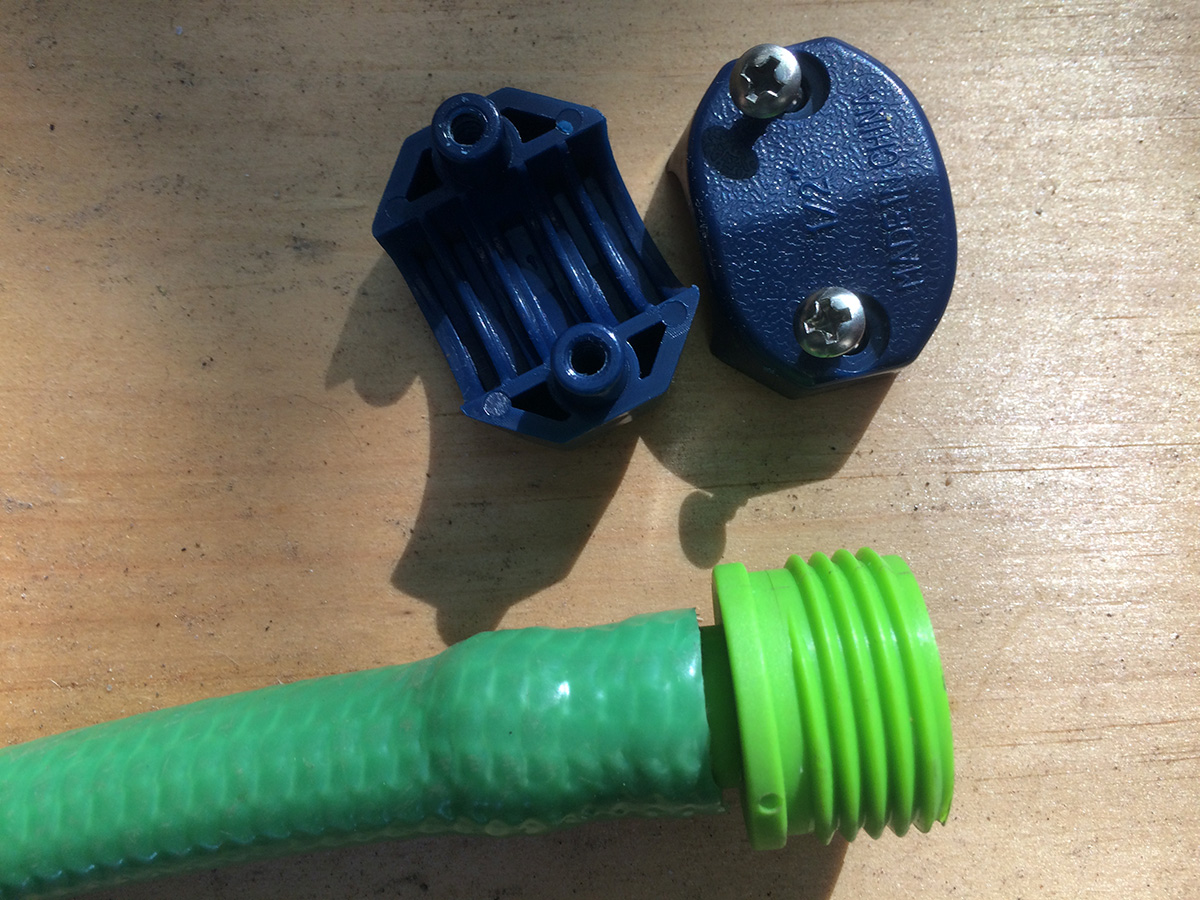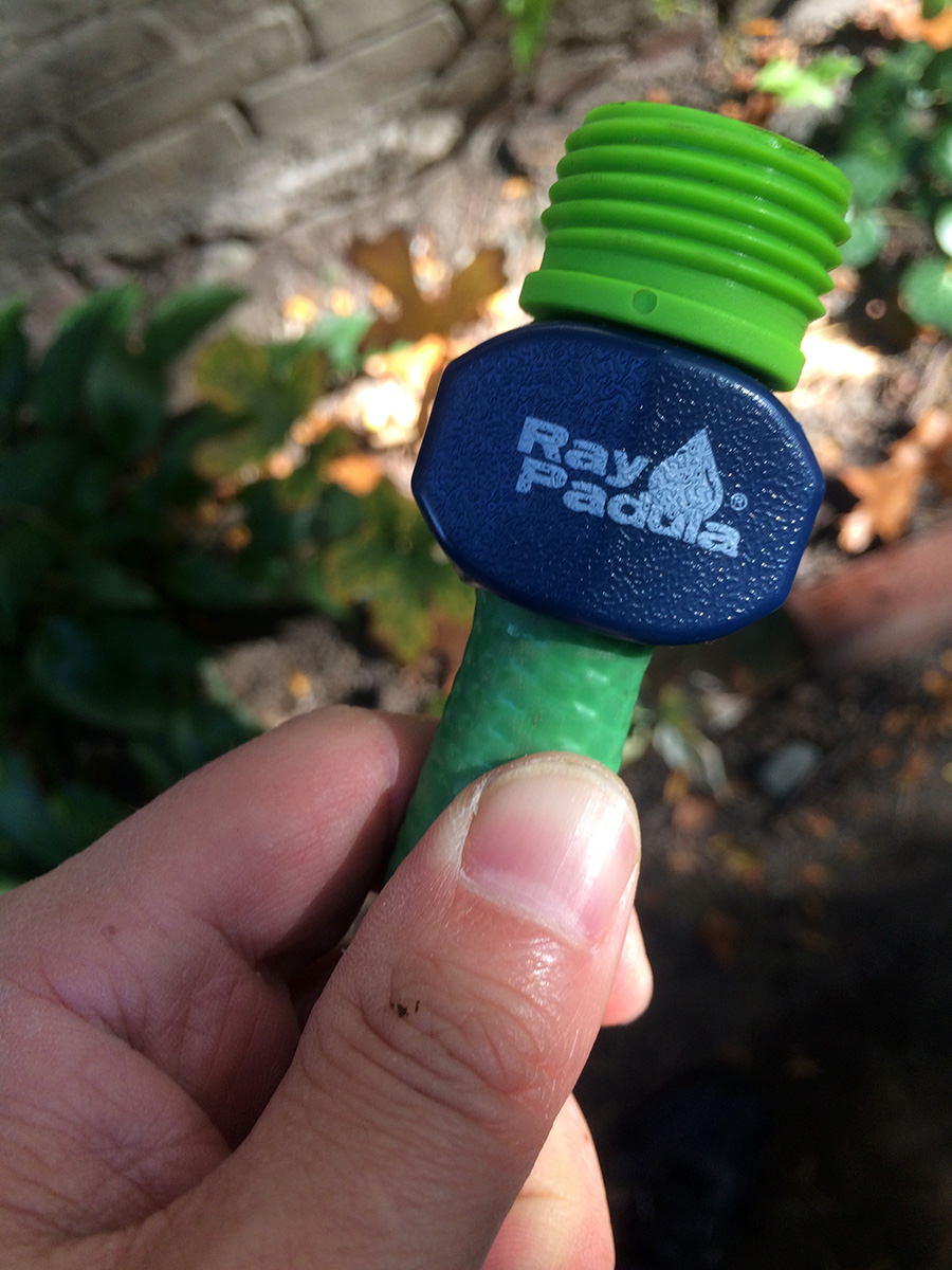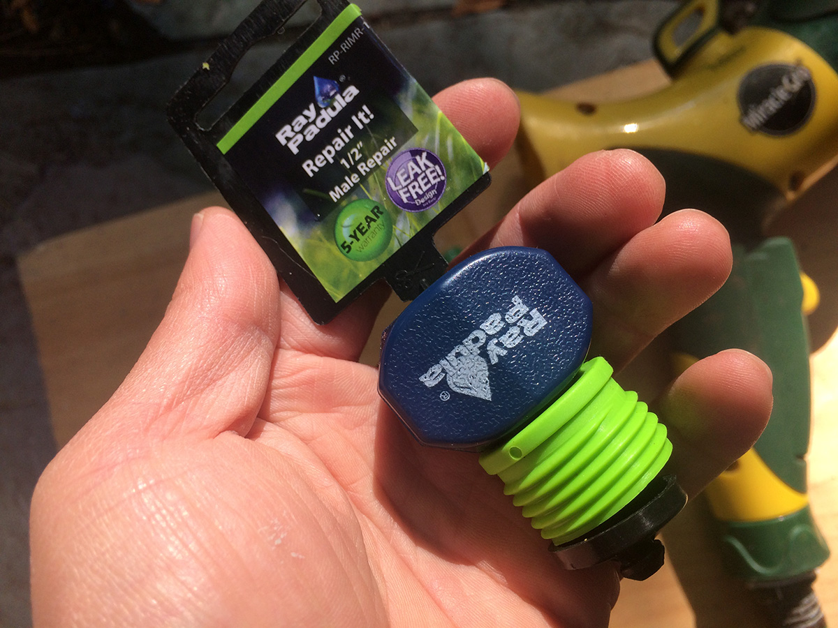 inserting the plastic nozzle in the cut hose took some effort. i had to wear rubber gloves so i could get a good grip and slowly twist and push the nozzle into the hose. afterwards i screwed the clamp into place. i turned on the water but it was still leaking! but not from the hose but rather the plastic sprayer, which is a piece of crap anyway. i screwed on the heavy duty metal orbit sprayer from my parents' place and it worked perfectly. however, i noticed a leak at the other end of the hose, which means that end has to be repaired as well. at this rate, it might be cheaper just to buy a new hose rather than trying to repair it. but in the spirit of conservation and not simply throwing something out because it doesn't work well anymore, fixing the hose is still the right thing to do. of course all this effort will go unnoticed by my upstairs neighbors, but i do these things for my own personal satisfaction.