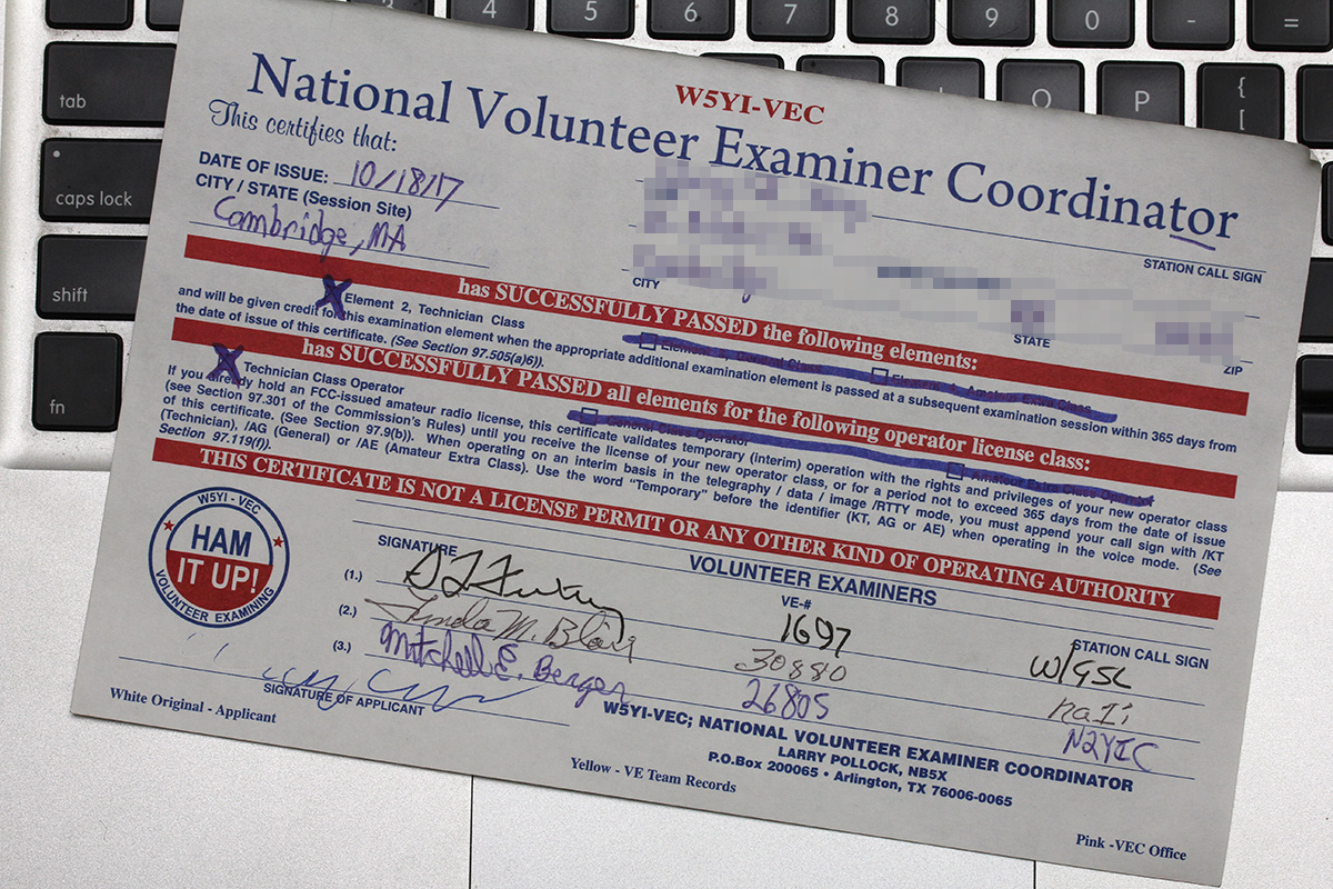 as the administrators graded each exam, they'd announce the result accordingly. everyone passed the technician. i passed with one wrong. then they graded the extra exams, and announced the results accordingly. only then did they begin handing out the certificate of exam completion. the whole process was very slow and tedious, i would've brought a book if i'd known. i felt bad for the few people who had to be somewhere else, including a brown university freshman who needed to catch the train back to providence (he missed it, hopefully there's another one). i didn't get out of there until after 9:30pm. next time, sit in front of the class so you can take the exam earlier and leave earlier.