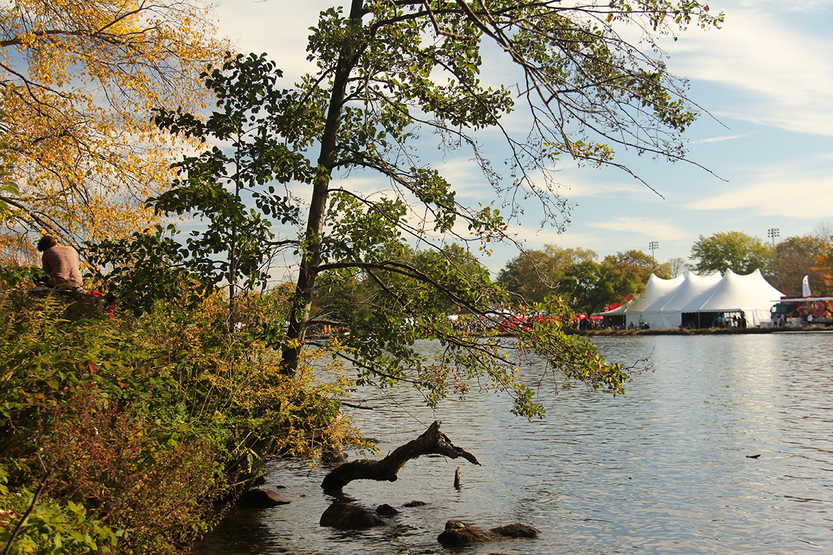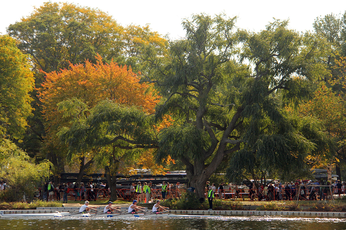 that elsewhere turned out to be by the eliot bridge, by the part of the river where it narrows a bit. i thought the place would be crowded but there were actually plenty of spots right by the shore to take photos. in fact, i was here with julie back in 2011, and the photos i took of the head of the charles were some of my best, as i could get very close to the water at the same level as the passing rowers.