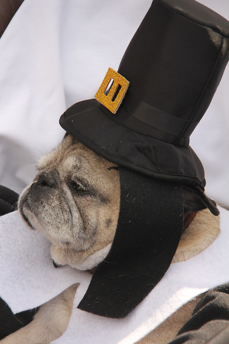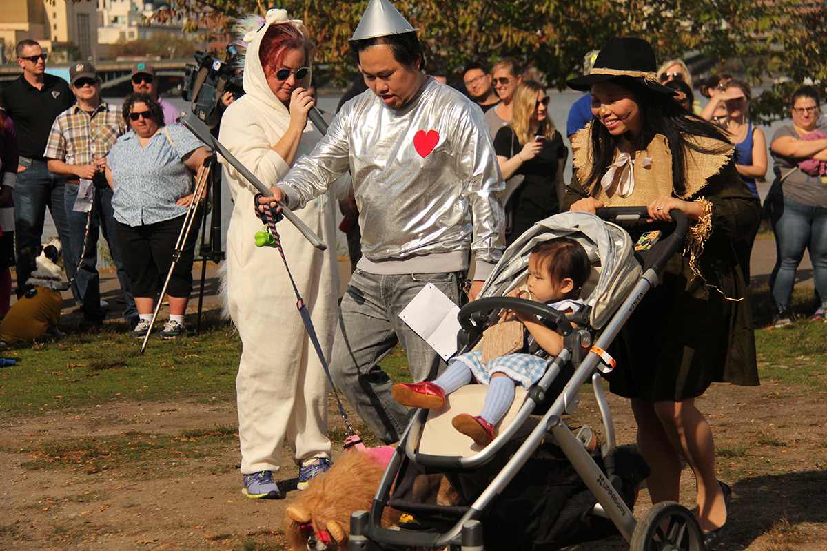 the promenade began at 1pm. paula and i parted ways so she could join the parade while i raced ahead of the procession to take photos. there was a good turnout of costume dogs despite the admission fee. the best costume that paula and i both agreed on was the little pug dressed as a pilgrim in a mayflower stroller. paula said she was at another dog social event yesterday, and the same pilgrim pug was there. there was just a single bumblebee costume, when i remember there were several the last time. there was a wizard of oz ensemble (minus a toto since the dog was dressed as the cowardly lion), and a weak wiz ensemble.