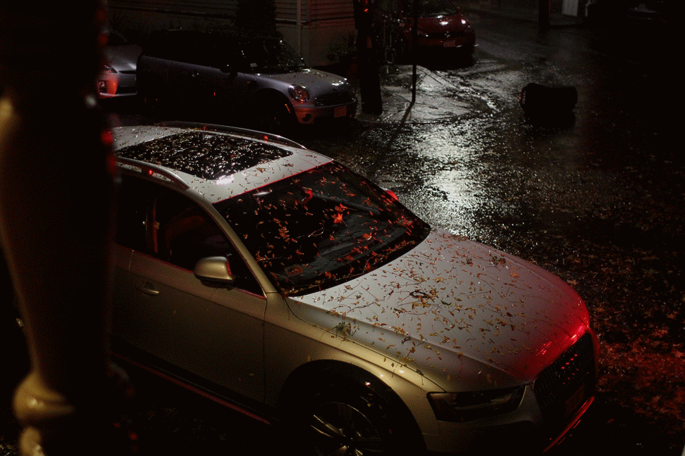 a heavy rainstorm arrived in cambridge during the evening. the rest of the night was spent listening to the sound of inferior gutters dribbling water onto the trash cans and incessant rain patter on the windows.