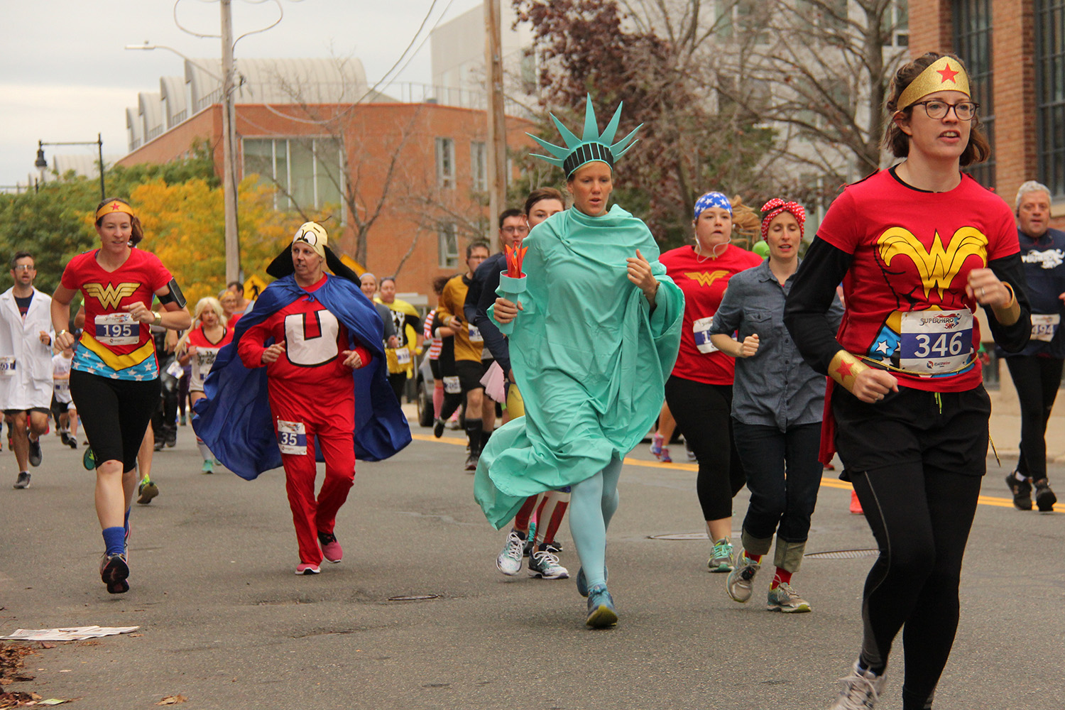 soon afterwards the runners started to appear. the whole procession took less than 3 minutes. the cambridge super hero 5k is the original halloween costume run, and this was their 9th year (i've been to the 2012, 2014, and 2015). but in recent years the newer boston halloween 5k (aka boston costume dash) has taken some (if not most) of its thunder, with more runners, and more costumes. the thing i noticed about the super hero 5k this year is so many people not bothering to dress up, and so many family groups, where the event becomes an excuse to walk their toddlers in a stroller (not even bother running). i'll still come see the super hero 5k if i don't have anything else going on (it's a lot close than boston), but it won't be high on my priority.