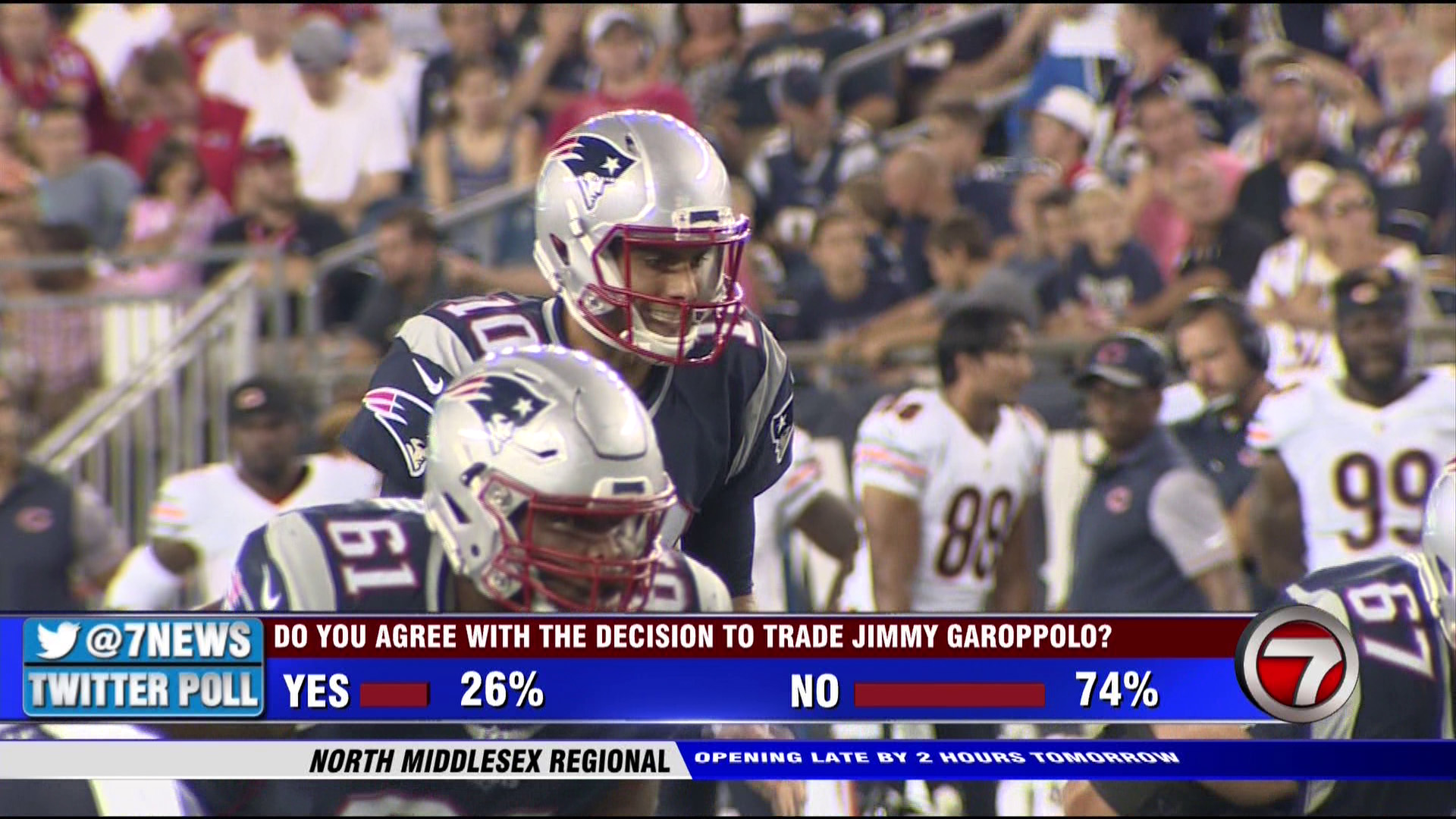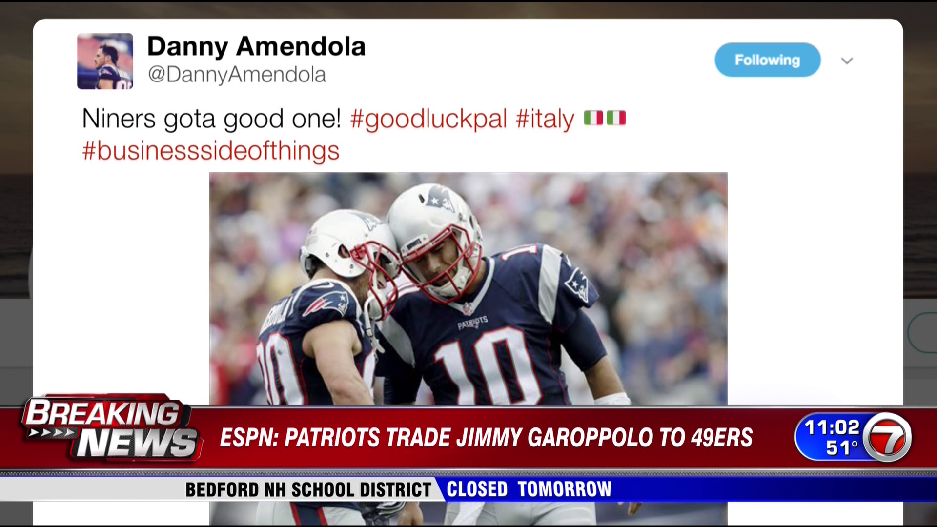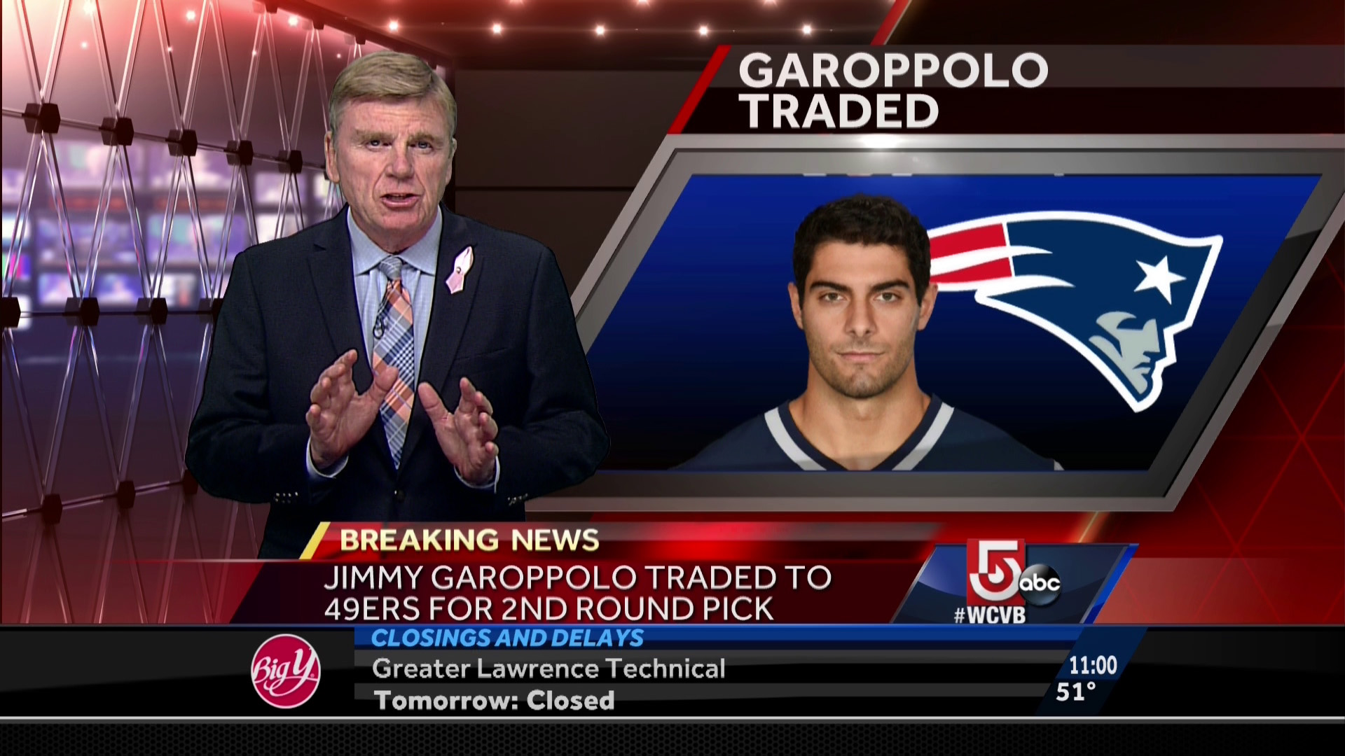 some sad and shocking news this evening: the patriots traded backup quarterback jimmy garoppolo to the san francisco 49ers, who along with the cleveland browns are the only football teams this season who still haven't won a game yet (0-8). the browns are perennially bad, but i was surprised the 49ers haven't won yet, with their storied franchise and a new head coach (kyle shanahan). but jimmy would've never been able to play in new england, not with tom brady vowing to play forever. had he stayed, by the time brady finally retired, garoppolo wouldn't be in him prime either. going to another team - especially one that desperately needs a QB - will allow him to finally play. unfortunately, SF's offensive line is terrible and i'm worried jimmy will get hurt playing for a trash team, and won't be able to get a good contract next season. i understand the decision made by belichick, but i'm still a little sad to see garoppolo go. in bill we trust, in bill we trust!
