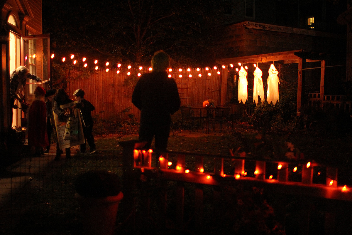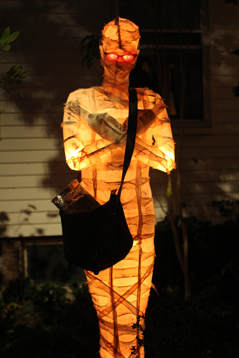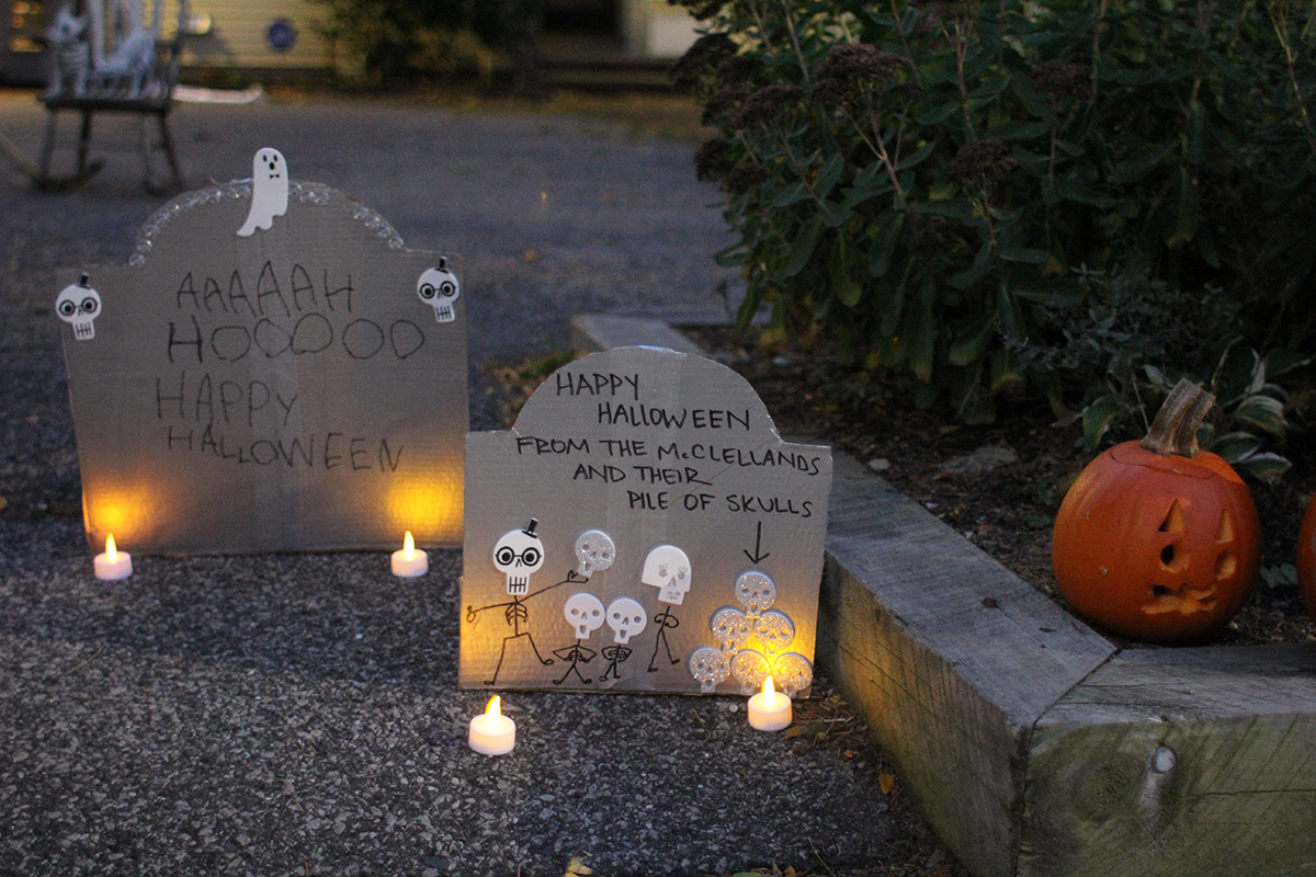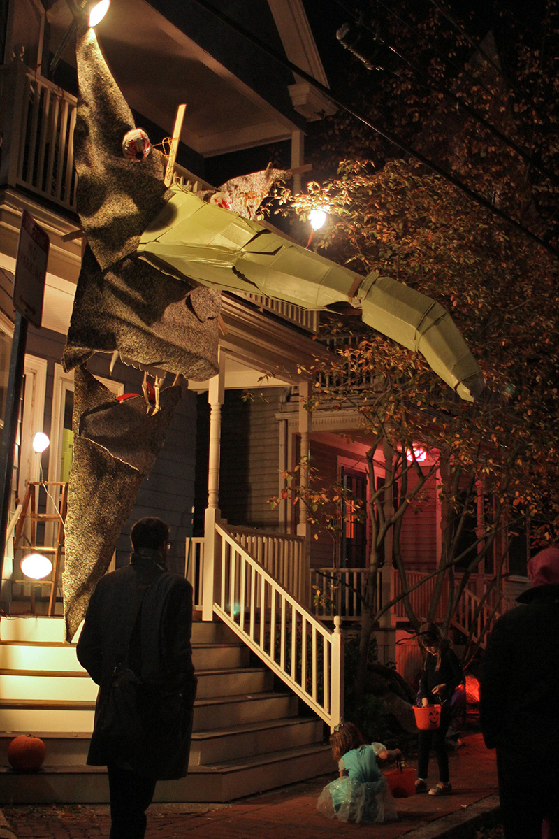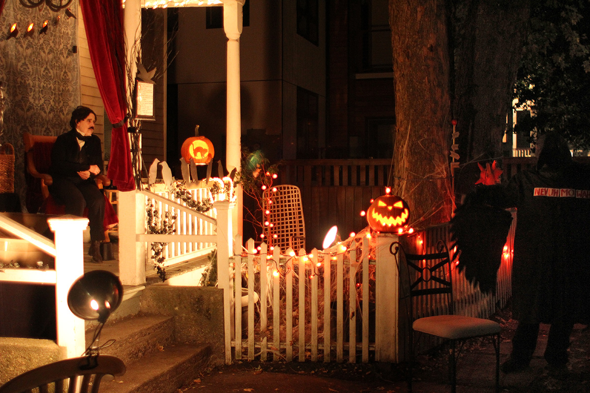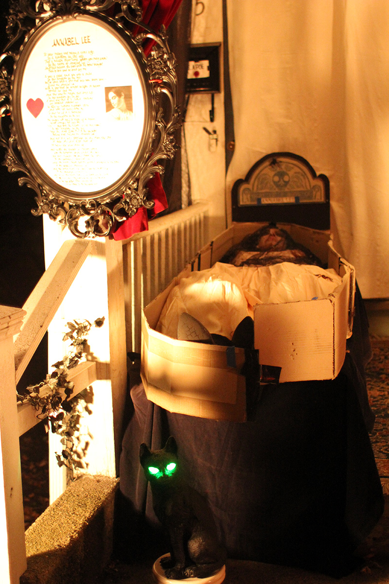 elsewhere on traymore it felt more like wake, with barely any children, and just a few houses putting on halloween displays. i fear eventually traymore will stop having elaborate halloween haunted houses altogether. around the corner though on harris was an edgar allan poe display, with spooky human-sized raven, poe lookalike, and dead woman sleeping in a coffin.