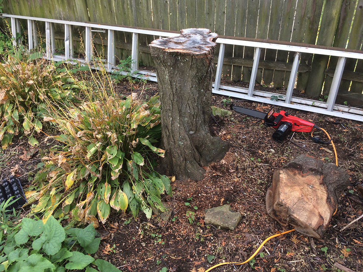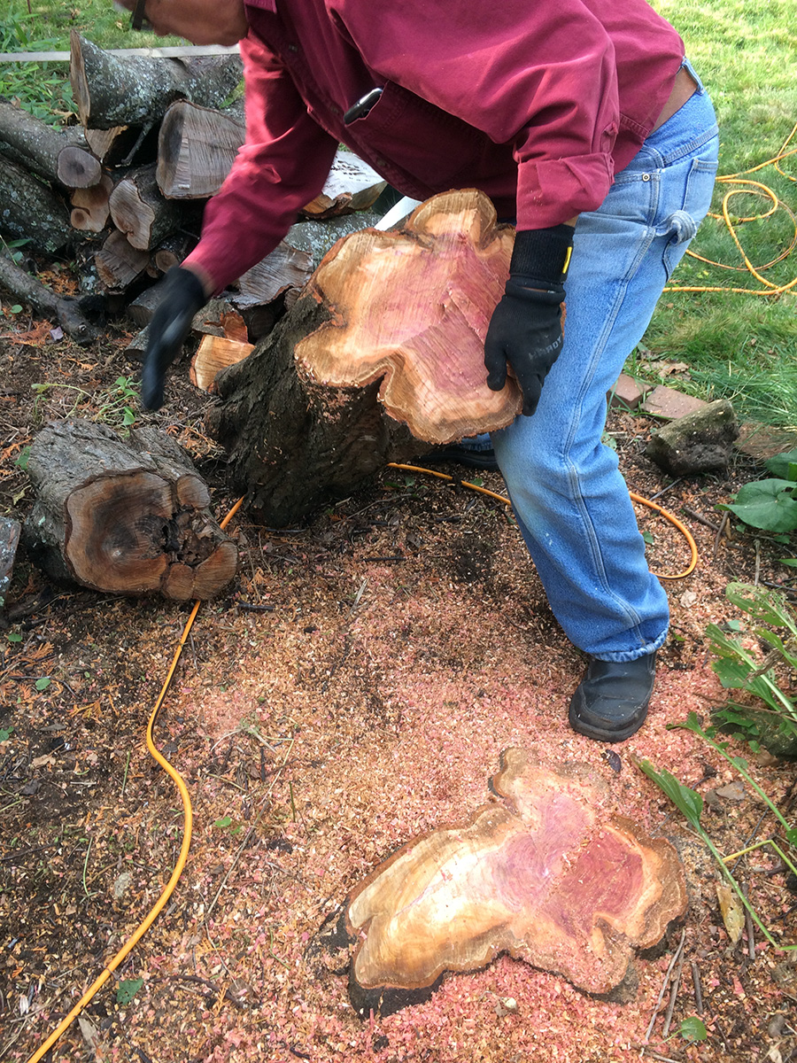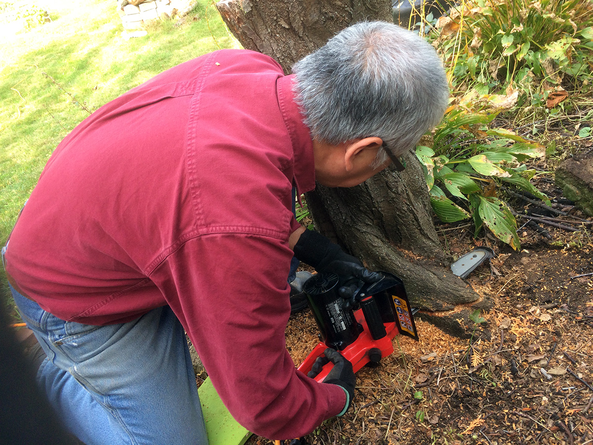 i talked my father into cutting up the dead tree trunk in the backyard, while the weather was still comfortable (upper 50's). the sooner we take care of it, the sooner the stump can rot so we can plant new trees come spring. first my father replaced the chain on the electric chain saw, one reason he thought why it was so hard to remove the last tree trunk. with fresh chain installed, it cut so much better, and we managed to cut in the trunk in under 15 minutes, when it took us several days to cut down the last tree trunk. one interesting thing was the pink wood shaving that came out from the cut.