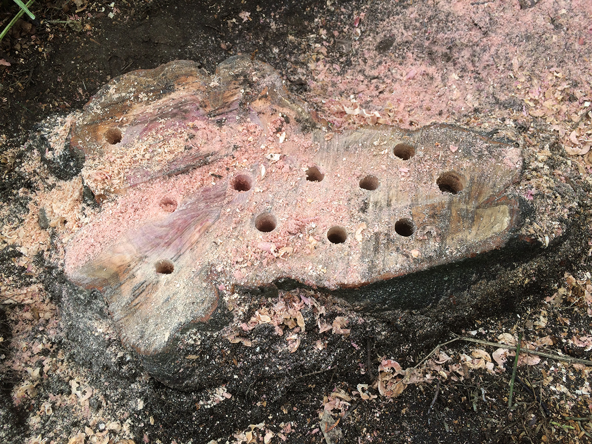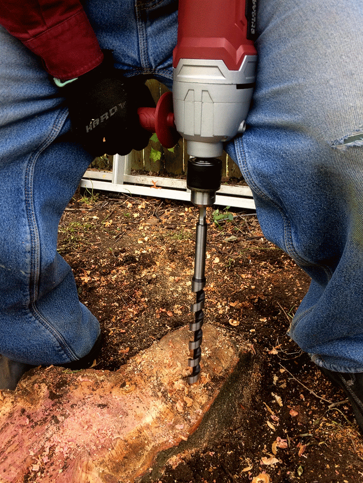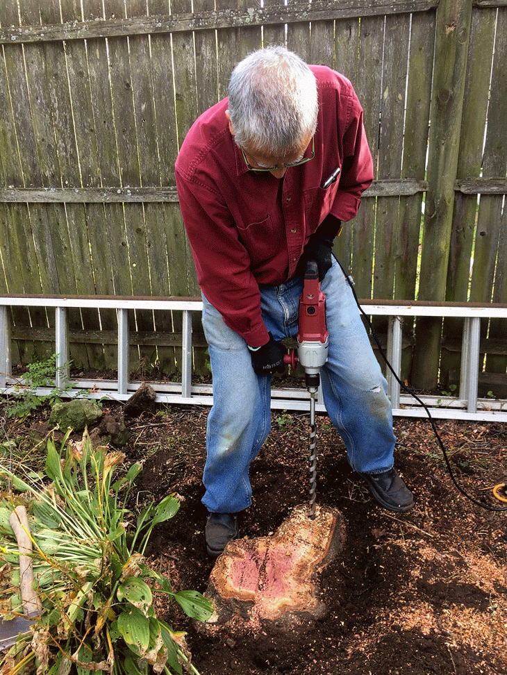 next came the hard part: drilling holes into the stump so we can pour in the stump removal chemical. i suggested we wait for the stump to dry up a bit, but my father said we could try drilling now. initially we used the 1" auger drill bit, but we were having a hard time getting it to bite into the wood. so we used the next smaller size, 3/4", which was easier to work with (though it's still scary seeing the wood smoking as we drilled). after about half a dozen holes, we reached the center, but the wood was just too hard to get the drill bit to bite into. so now we're going to give it a few weeks to dry up a bit and then try again. we did try using a spade bit, which works a little better because it didn't want to kick back like the auger bit does, but even the spade bit couldn't penetrate the heartwood.