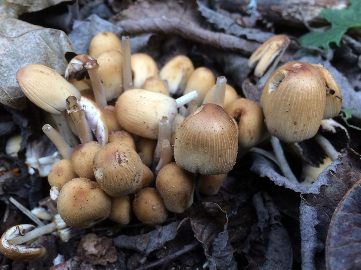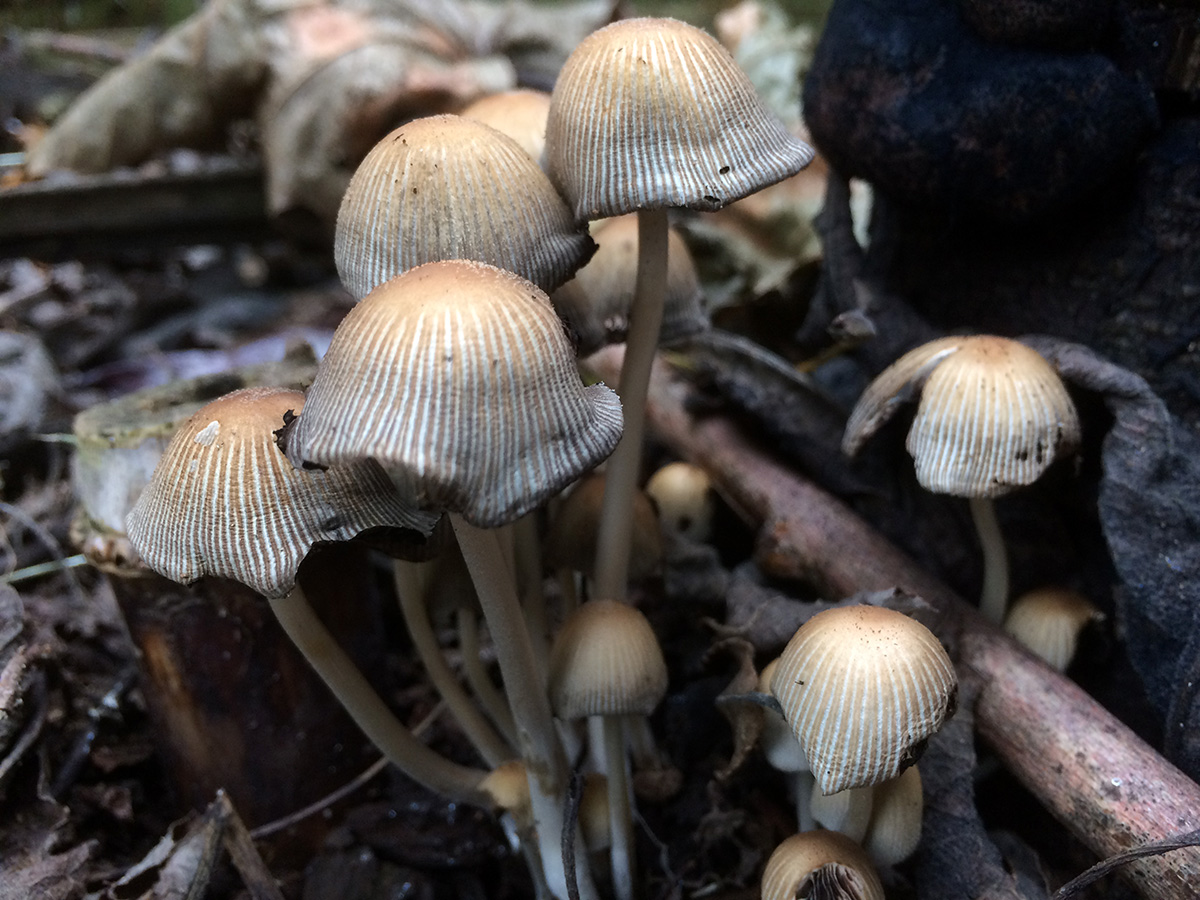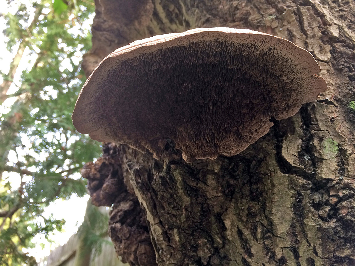 elsewhere in the backyard, an assortment of mushrooms are growing in the area around the pussy willow tree. on the ground are what looks to be straw mushrooms, and up on the tree trunk itself (both the living and the dead) are shelf mushrooms.