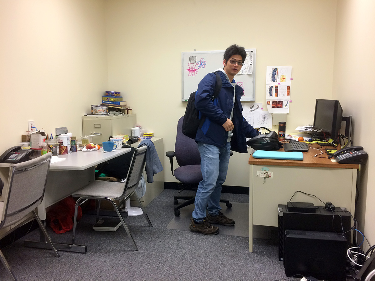since we'd go by his office on the way to the cemetery, li decided to bring his laptop and drop it off first so he could do some work afterwards. i've had astrophysicists living at my place for over 13 years but i've never been inside their work place before. it was not how i'd imagined it, like a fluorescent-lit open office with cubicles. instead, it was mostly dark hallways with closed door shared office spaces. some offices had windows, but the ones in the center of the building do not and there was a jail-like quality to the place. of course li had one of the windowless offices, which he shared with an english colleague here for his PhD as well.