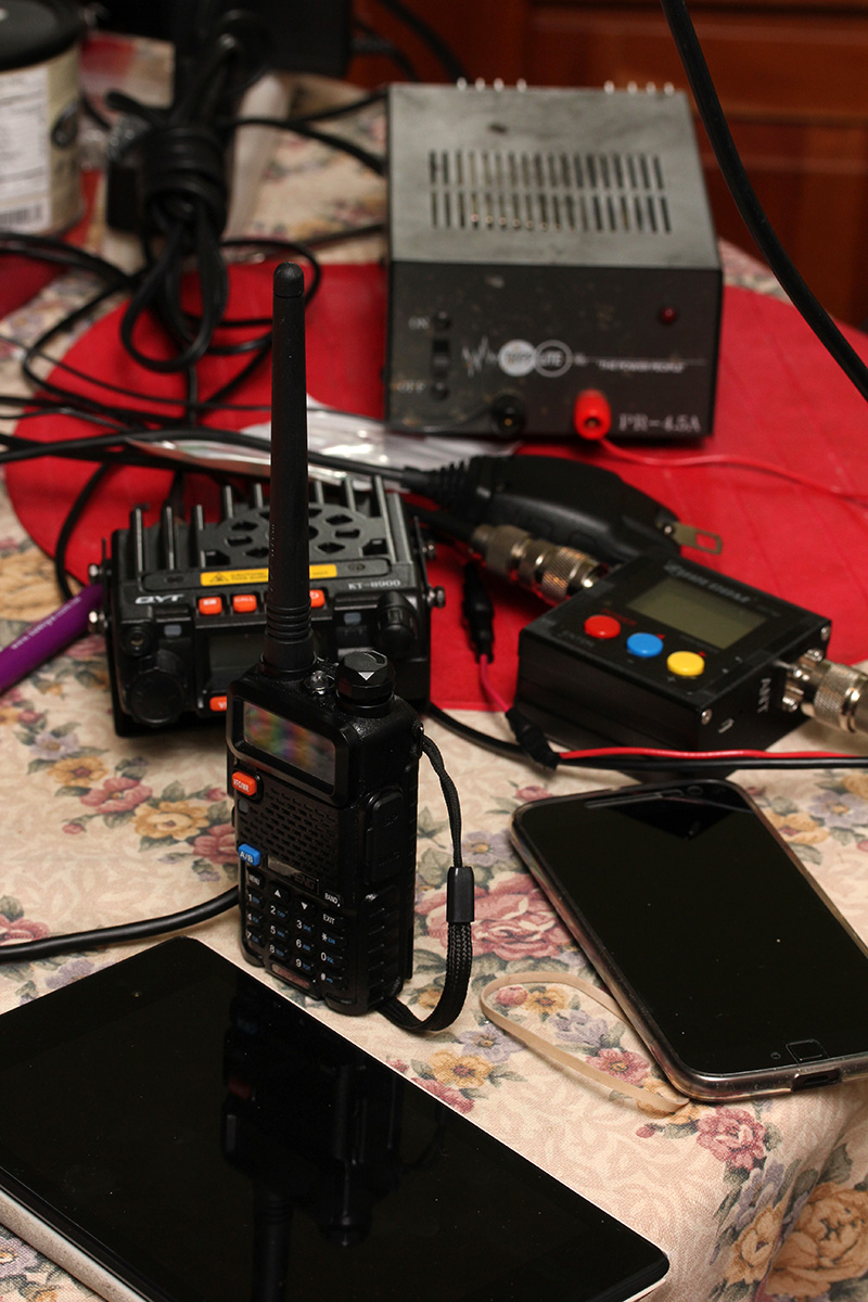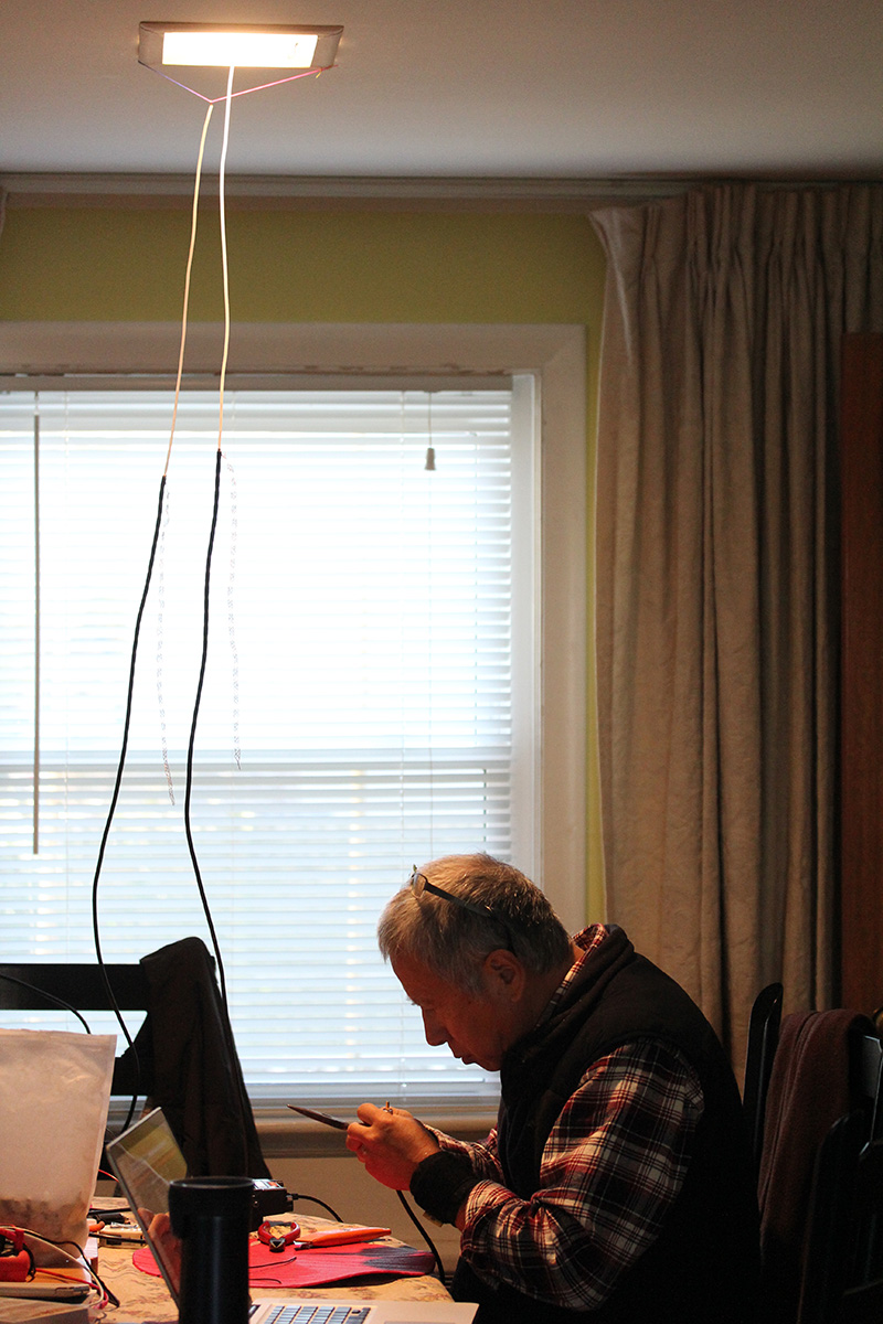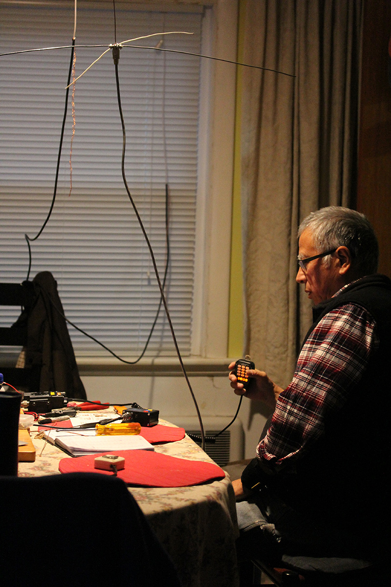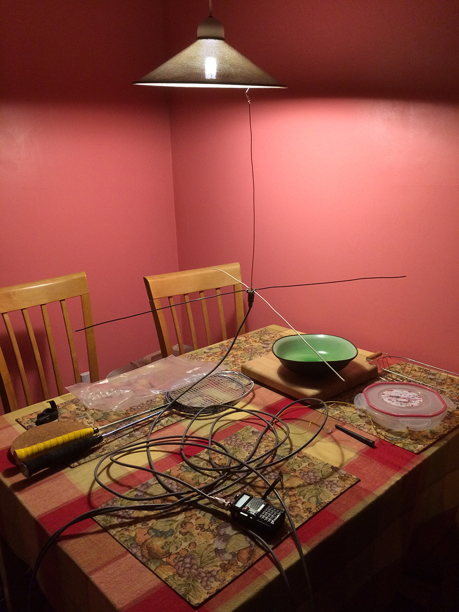 my father returned home from the cafe early, around 1pm. he immediately went to work on creating another 2m ground plane antenna. the dining area quickly became a workshop of hanging radio antennas.