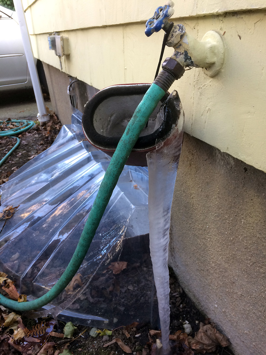 coming into my parents' house i noticed the large icicle that'd formed from the front faucet. afraid that maybe the pipe inside had burst, i quickly went to check it out. it ended up being just the water that was inside the garden hose being pushed out when the water inside froze. i unhooked the hose and was about to put the insulated cover on the faucet but there was ice inside the cover so i have to wait until it thaws out.