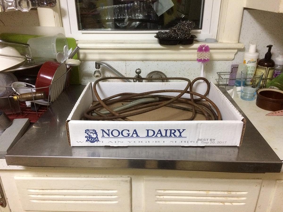 when my father came home in the afternoon, we went about cleaning out the drain. he unspooled a wire coat hanger and stretched it out so it was now a long wire. while i held the bucket, he poked at the obstruction. i was expecting a lot of gunk to pour out, but it was just a bit of sludge, a few fistful at most. when he couldn't feel anymore blockage, we closed the cleanout cap and went upstairs to turn on the water. initially the water looked like it was still blocked. my father used the plunger to give it a few good pumps, but the plunger was broken, the rubber tore from all the plunging we did the past few days. but suddenly there was a gurgle and the drain started flowing again. success! blockage unblocked! my father then spent some time cleaning the kitchen sink. after he was done i went back with a magic eraser to clean off all the rubber scratch marks.