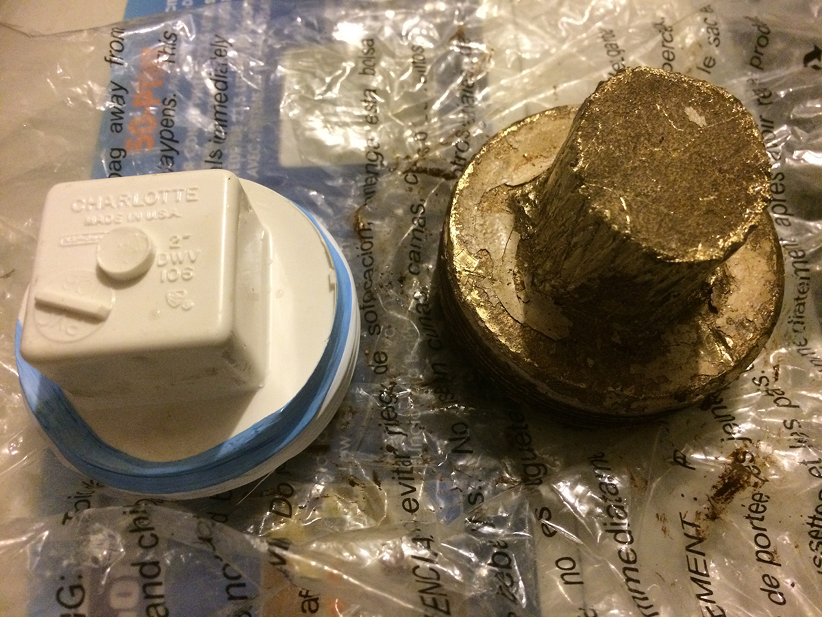 frank returned a short time later with a plastic cleanout cap. plastics are not as sturdy as brass, but they're easier to remove and replace if broken. "did you clean out the drain already?" he asked. i said i was going to wait until my father came home. "i could do it for you easily," he said. i told him we wanted to save some money and would take care of it ourselves. he understood. he gently put the cap into place, warned me now to mash the threads when i put it back in place, told me to wrap some teflon tape on it beforehand. and with that we were done. total cost? $113, $110 for labor, $3 for parts. it was money well spent, because there was no way my father and i would've been able to remove that cap. even if we had a larger wrench, we just didn't have the strength.
