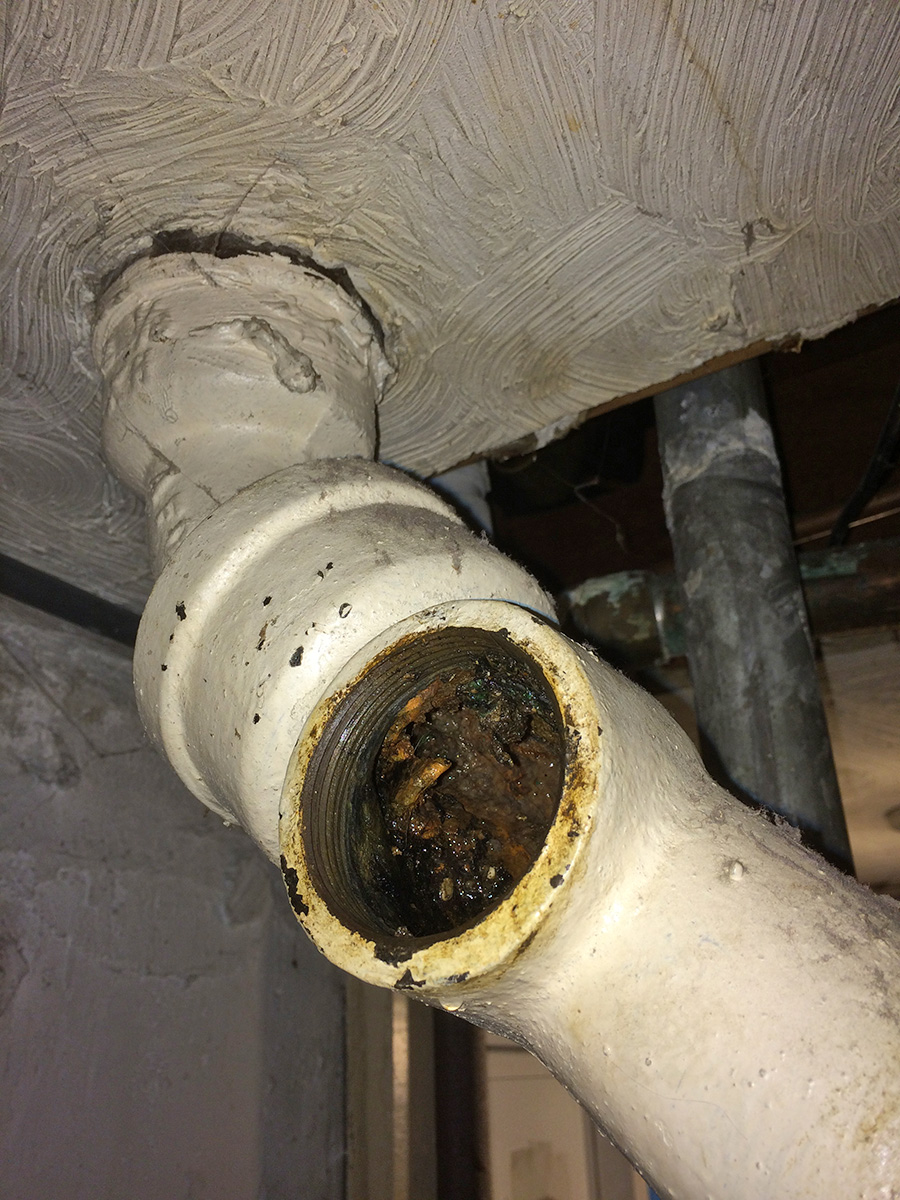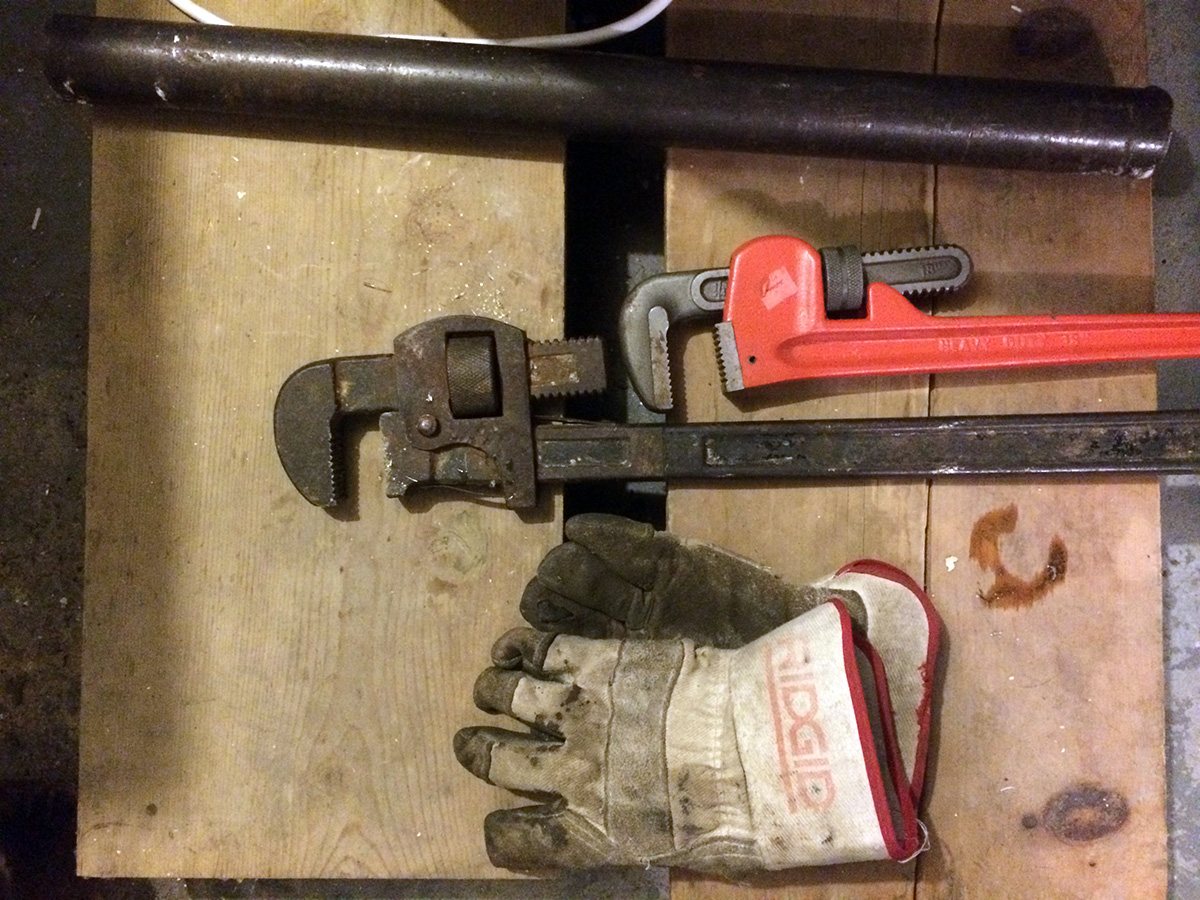 he grabbed a large pipe wrench, much larger than the one we were using. he said he found it at a job site, the owner just gave it to him, an antique, easily a hundred years old. he worked the cap with the wrench, pulling on it with short yet forceful yanks. he also had a length of pipe that he insert into the wrench handle for increased leverage. he must've pulled on it for 40 minutes before the cap finally started to give way and come lose. by that point the cap had lost its hexagon shape, nearly round. we covered the area with plastic trash bags and got ready to catch anything that fell out, but it was only a little bit, not the shower of oily mess i was expecting. frank asked if i wanted him to snake it, i said i could do it. he left the house to go buy a new cleanout cap.
