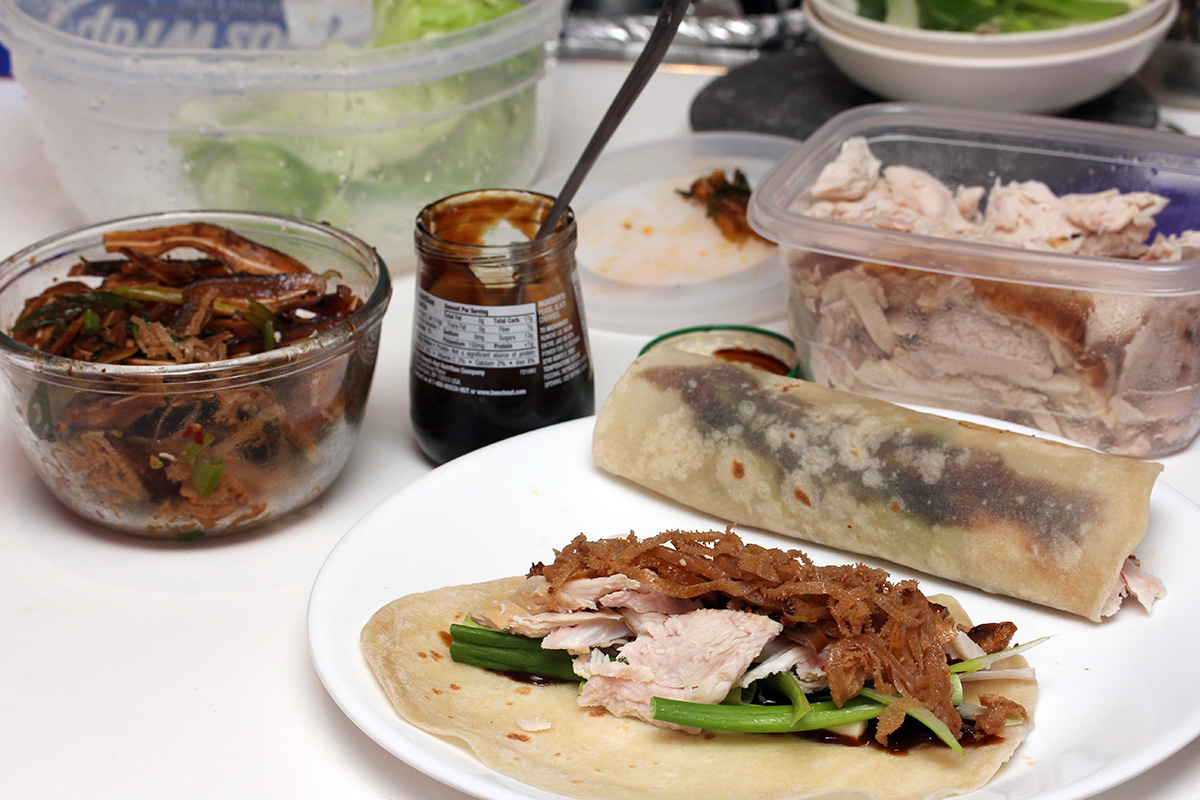 i shared some of the leftover thanksgiving with li, who's never had it peking duck style before, but said it was pretty good. he was ecstatic when he saw pig ears, which he said it's been forever since he had that. later we ate the 2 leftover flan i had in the fridge, he liked that as well.