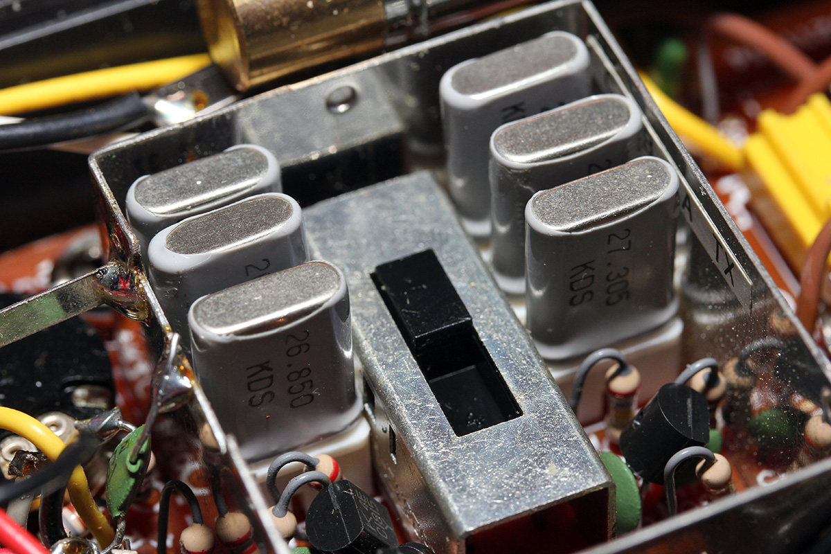 in belmont, my father opened up his old CB radio to show me the crystal array. these old analog CB's, each channel (3) is registered to a pair of crystals, one for transmitting, one for receiving, with a difference of 455KHz. my father thought the installers made a mistake because he noticed a repeat crystal but after doublechecking he just misread a 5 as a 6.