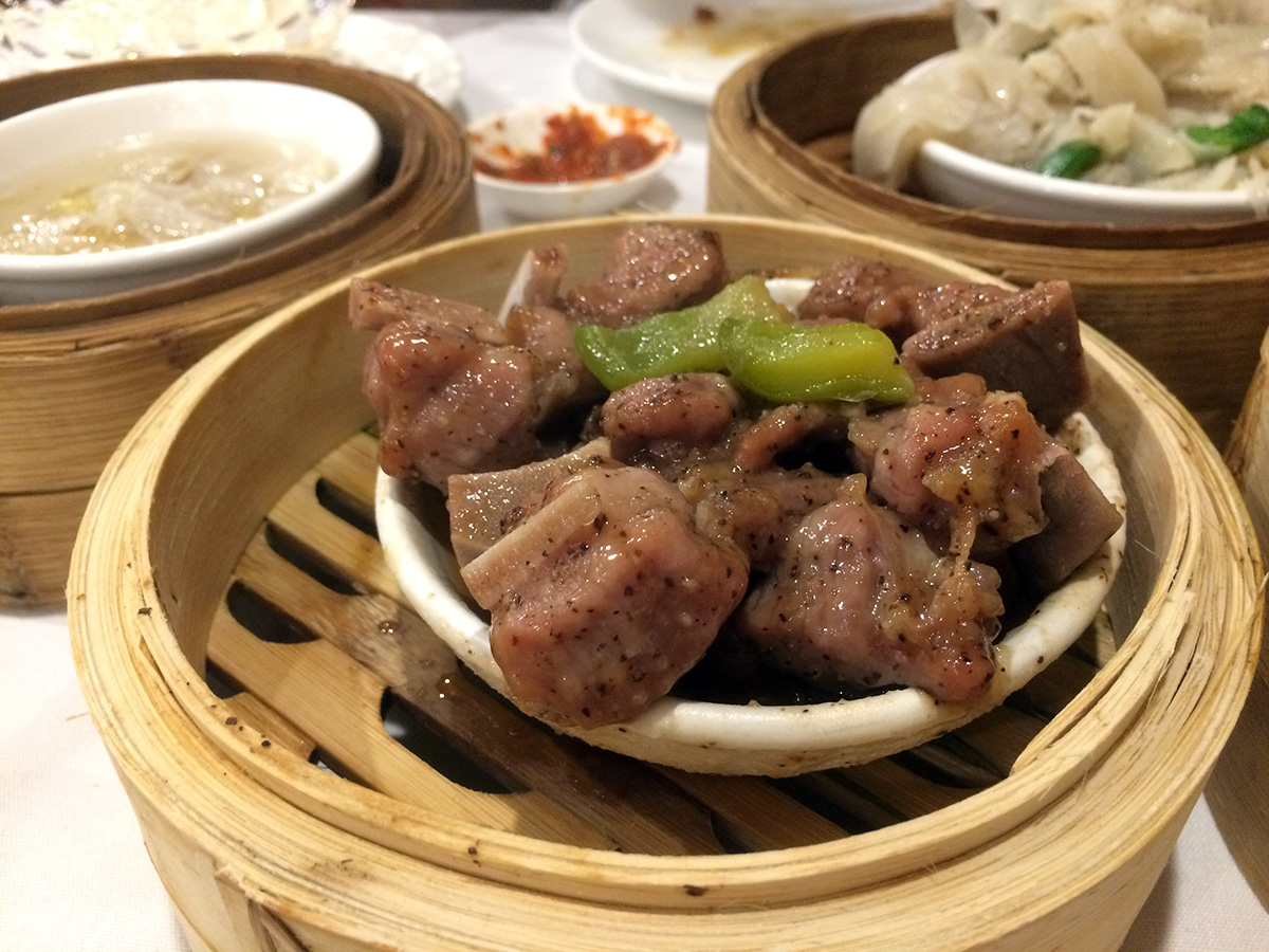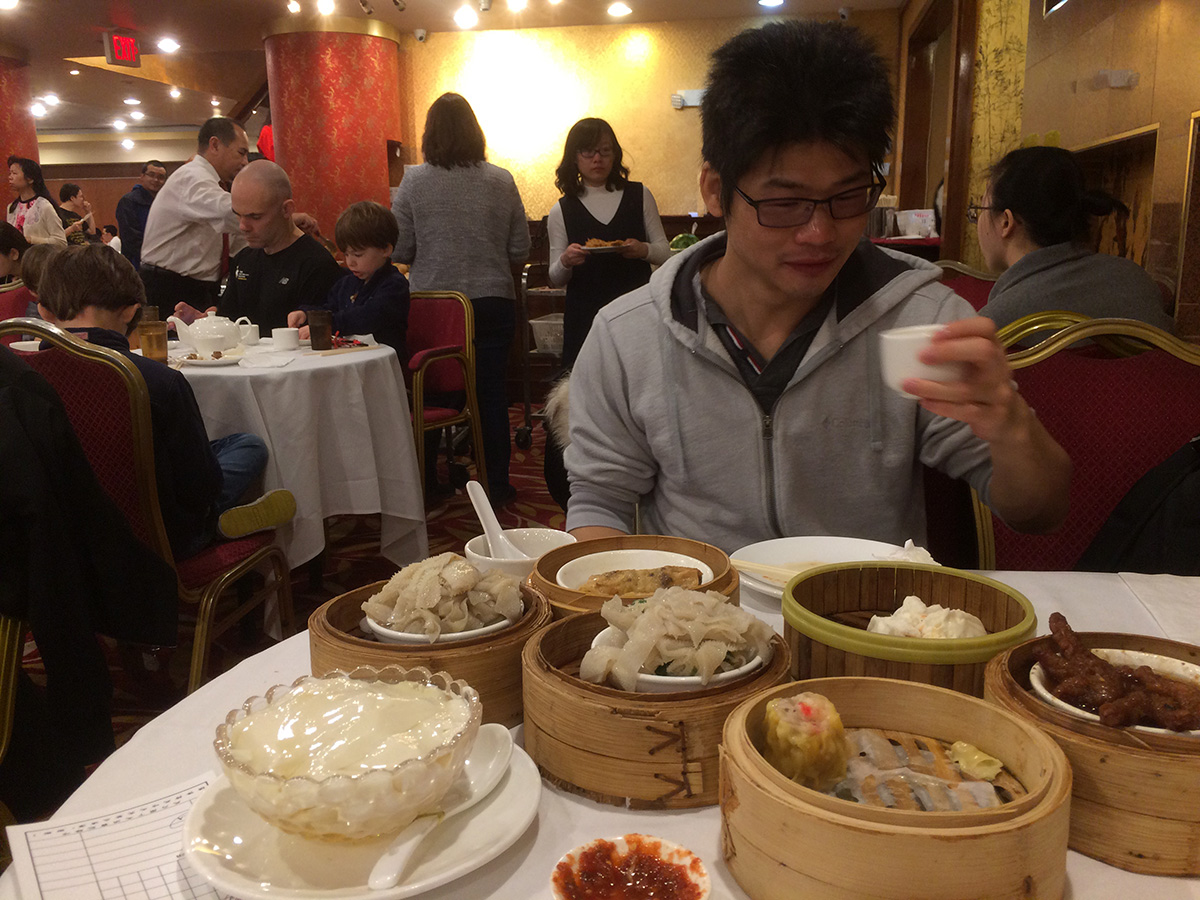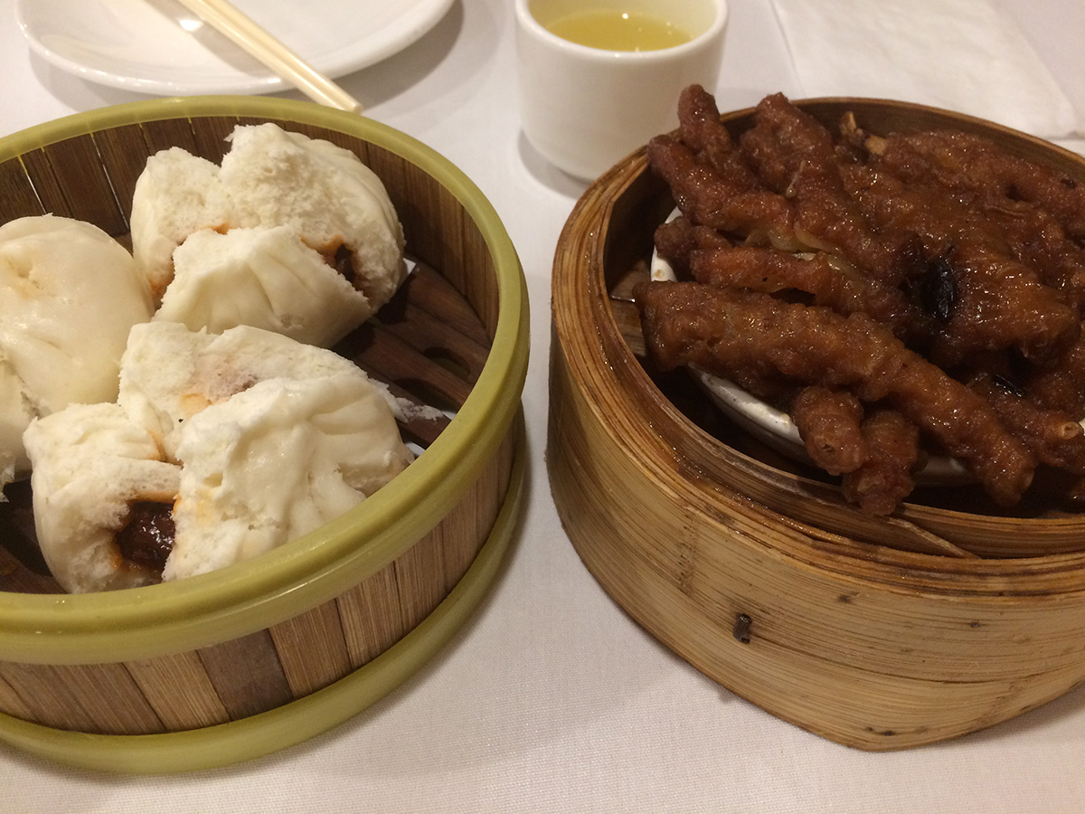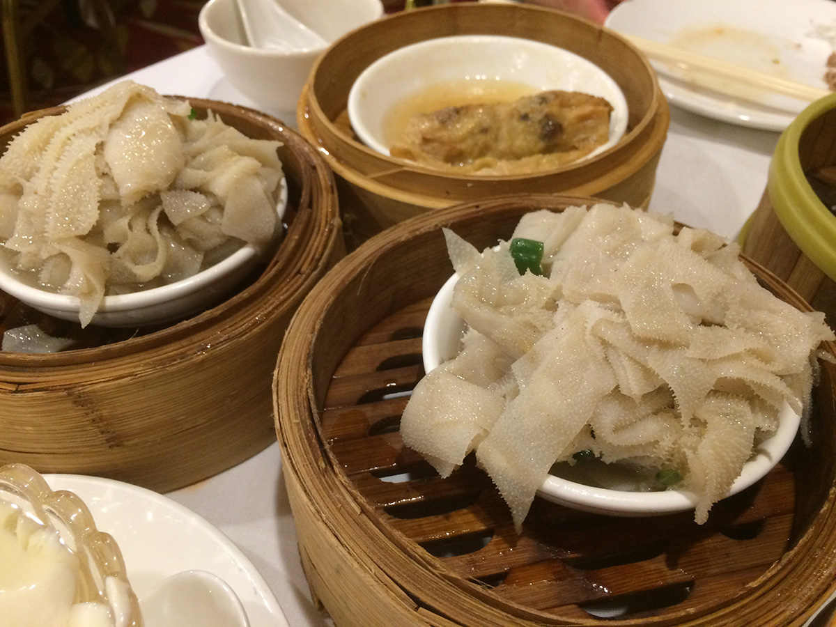 it took us just a bit over 20 minutes to arrive in chinatown, park our bikes, then go to hei la moon. it was crowded, we went downstairs to get a table, and even then there was a few minute of waiting. the table we got was up against the wall and surrounded by other tables, so the carts never came to us, we had to go to the carts. the one good thing was it was quiet where we were.