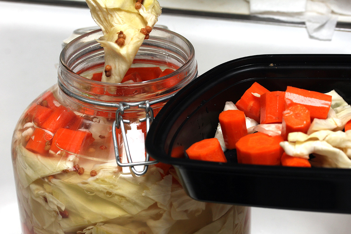 we opened up the jar of sichuan paocai i've been fermenting since mid-october, more than a month ago. i was afraid it'd explode from the pressure but it opened up with zero fanfare, apparently there was enough of an air gap for the carbon dioxide to compress or escape. the cabbage was sour which is what i like but my mother said it was too sour.