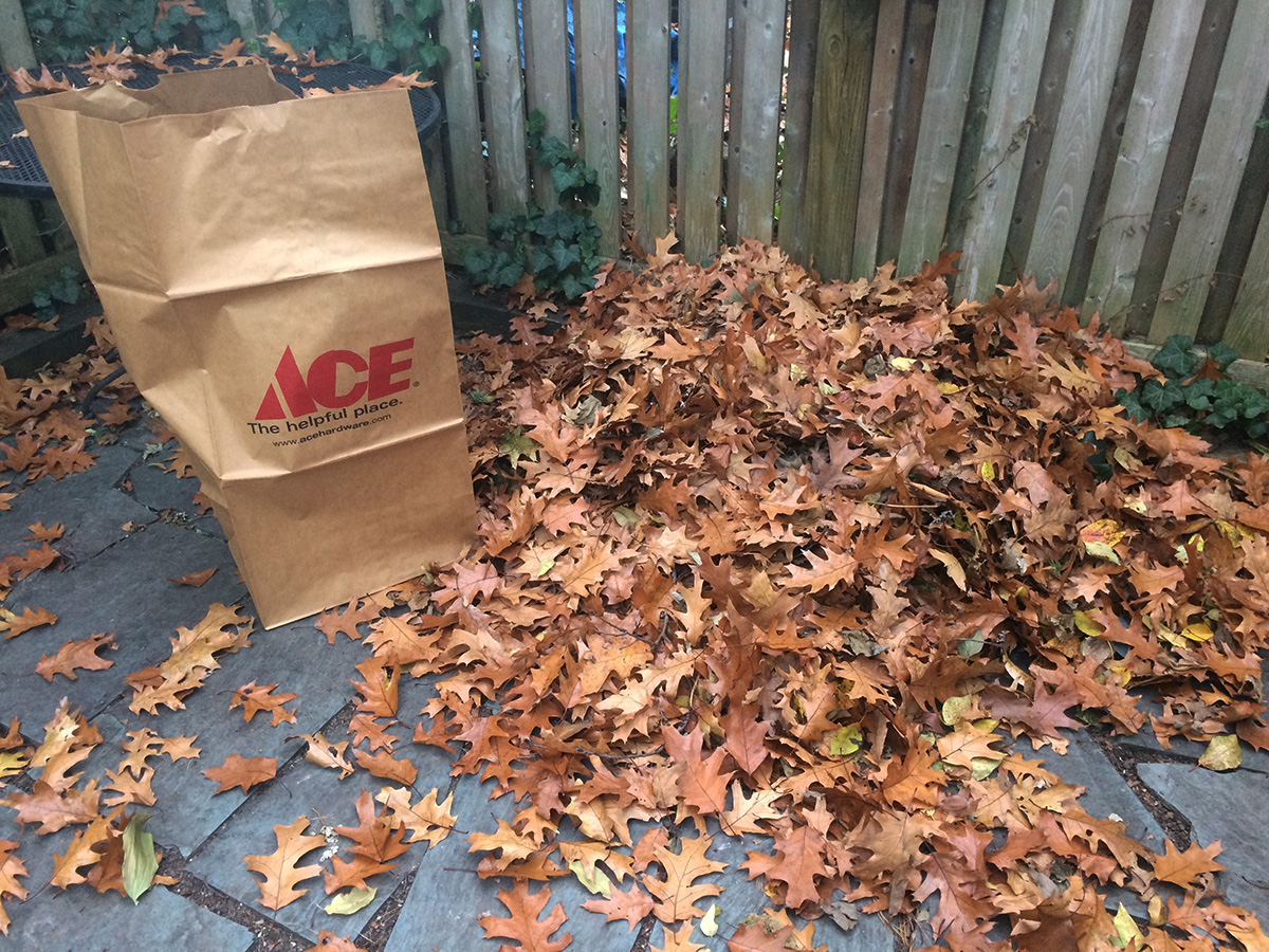 i raked the backyard of oak leaves when i got back home, ended up filling 2 paper bag worth of yard debris. it was kind of cold, temperature in the lower 40's, but i still took off my jacket because it was too bulky to work in.