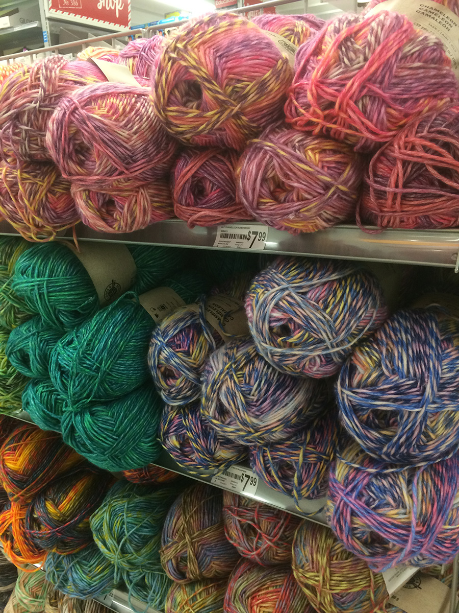 in the afternoon i went to michael's in search of frosted plastic sheets for my DIY lowel ego project. i'm not even sure what the material is called, nor if michael's would carry it. they didn't, but instead of leaving empty-handed, i sent my mother some yarn photos and left with a skein of new chameleon yarn with a 50% off coupon ($3.99).