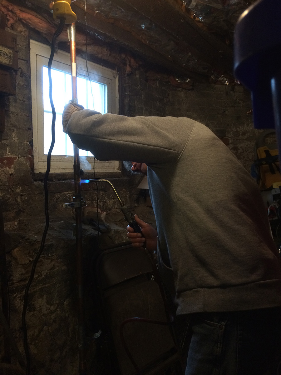 next came the soldering, as he fired up the torch again. my job was to hold the lamp so he could see. once again he was having problems, as the soldering wasn't taking. "i might have to remove this whole section and install a new brass fitting," he said. sometimes pipes get heated and repaired enough times that it loses its ability to fuse properly. frank said he'd try something else, something calling "buttering" which is just to apply even more solder. that seemed to work better. while he soldered, he used a paper towel to haphazardly flick off the excess molden solder. at one point some solder flew in my direction. "sorry," frank said.
