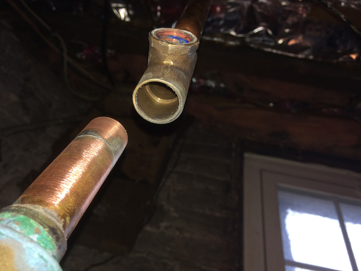 things weren't looking too good until frank put the spigot back in place and gently struck it upwards with a mallet while i continued to heat the brass fitting. that finally seemed to do the trick as we managed to release the piping. "there's no solder in here!" frank exclaimed when he looked into the copper pipe. he said the previous plumber didn't do a good job sealing it and it was a miracle the pipe wasn't leaking even more. he said sean should pay for this repair and he (frank) saved sean some serious liability claim had the pipe did burst and flood the basement.
